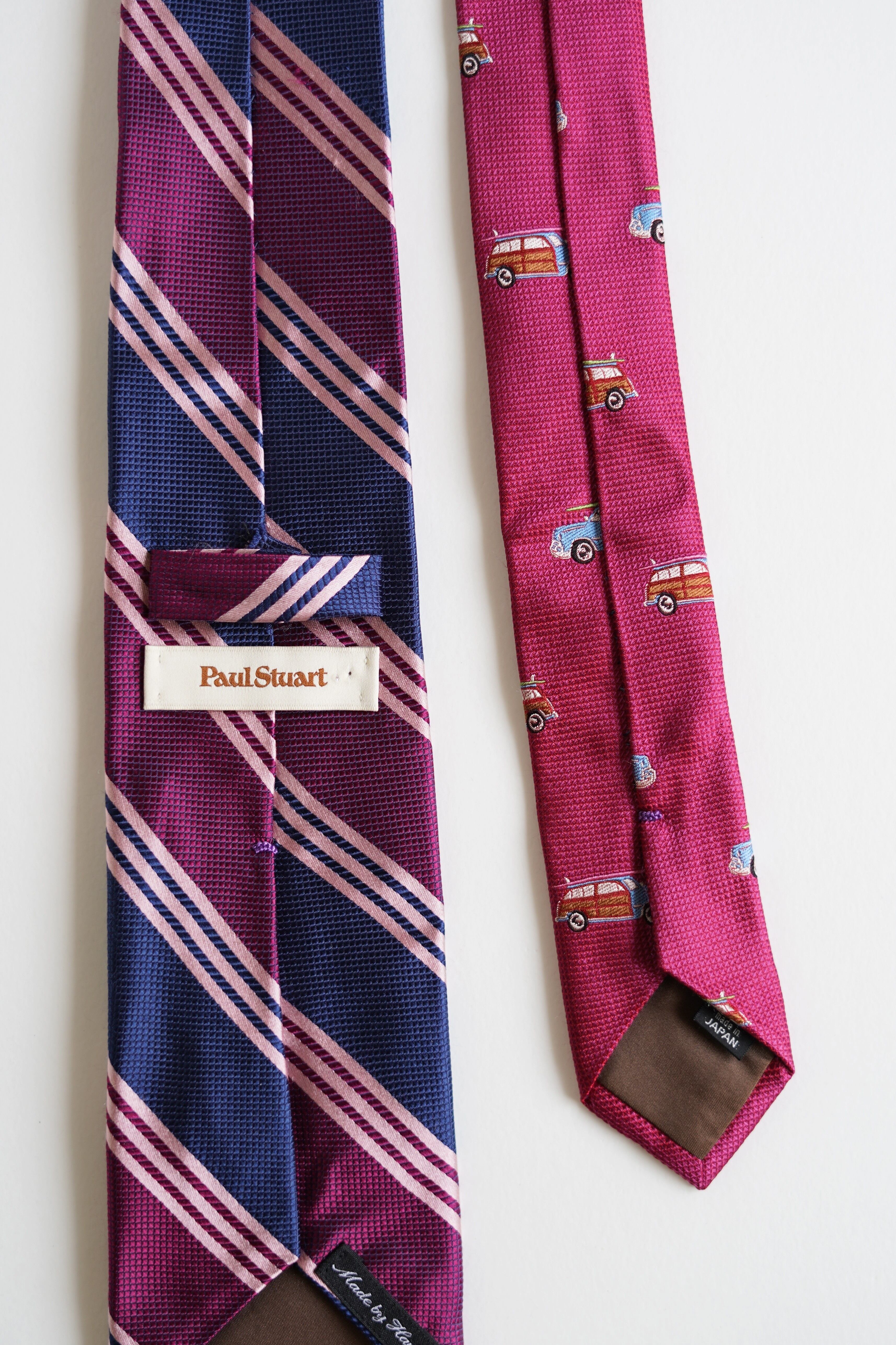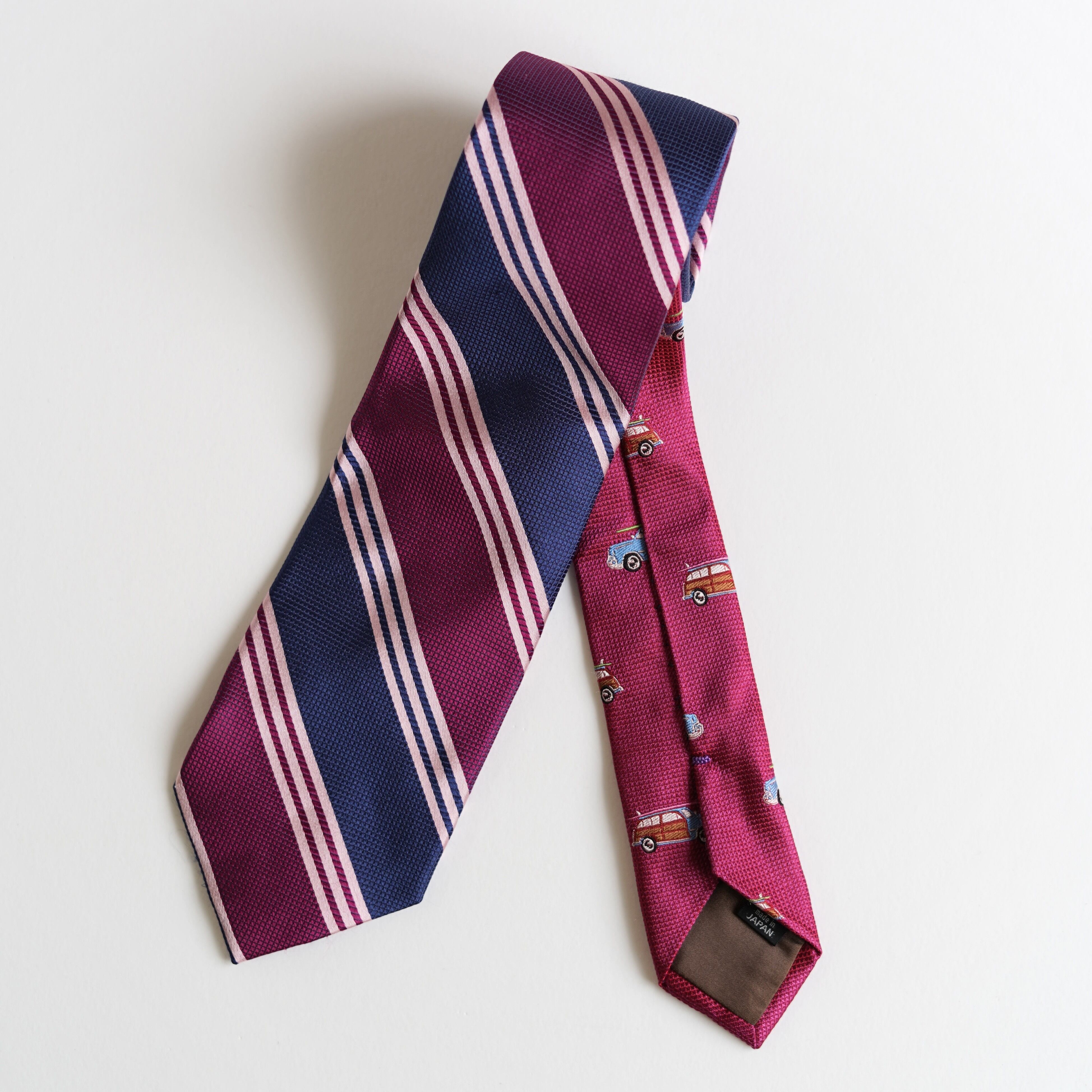 シンプルだけどちょっと個性的。ポール・スチュワートのレップタイは、さりげない切り替えしデザイン。サーフボードを積んだ車のプリントで遊び心をプラス。普段のビジネススタイルやちょっとしたお出かけにもぴったり。カッチリしすぎず、さりげなくオシャレに決めたいあなたにおすすめの一本です。