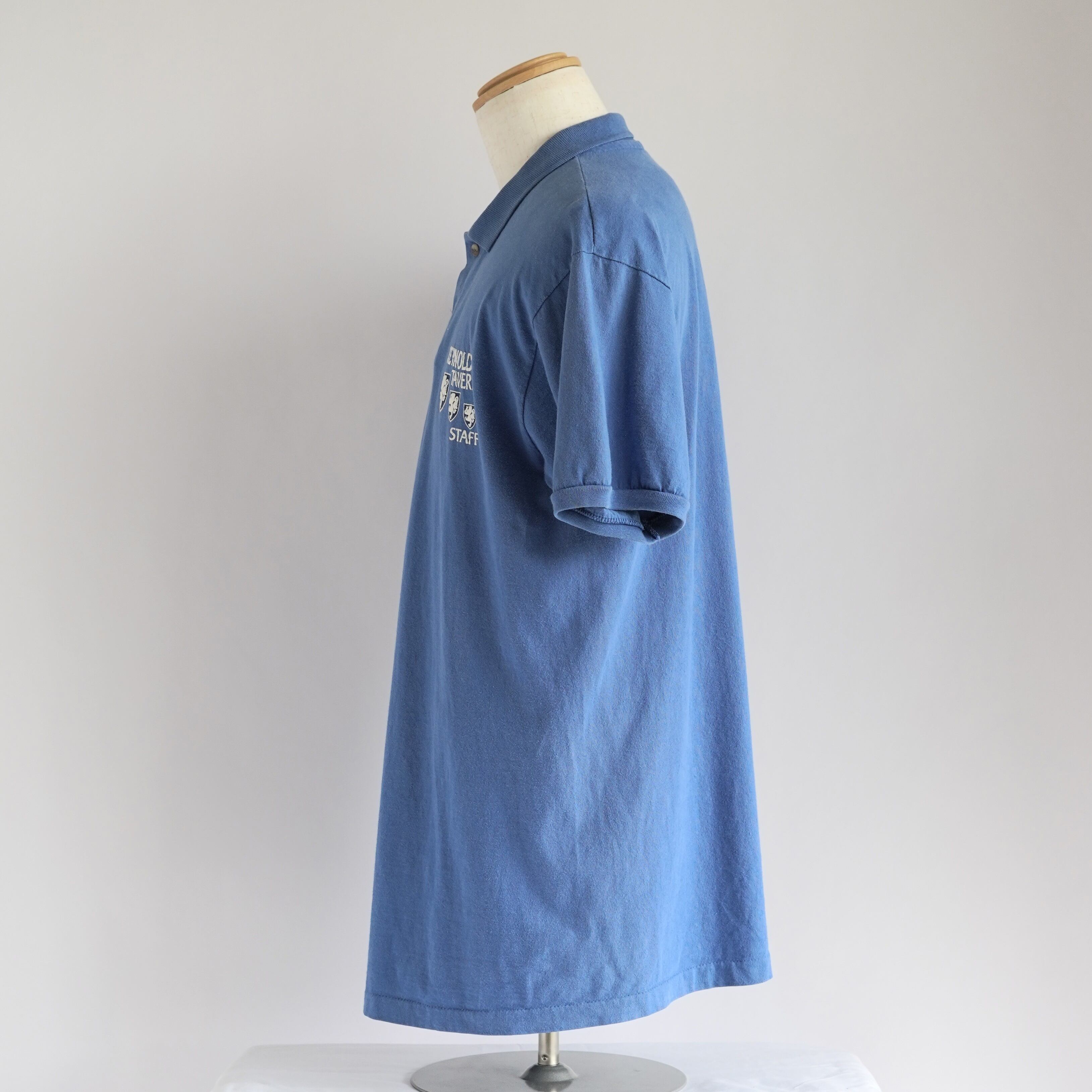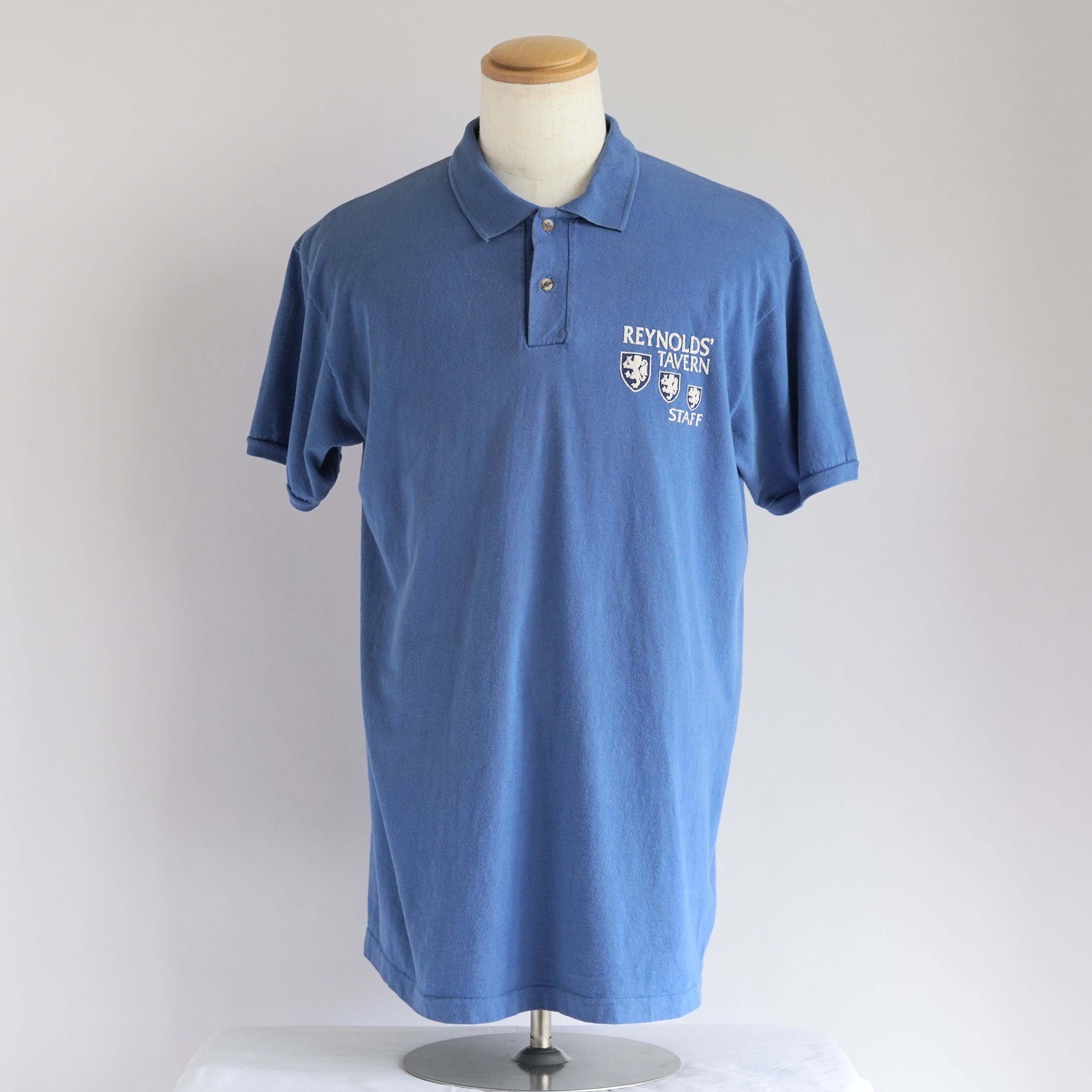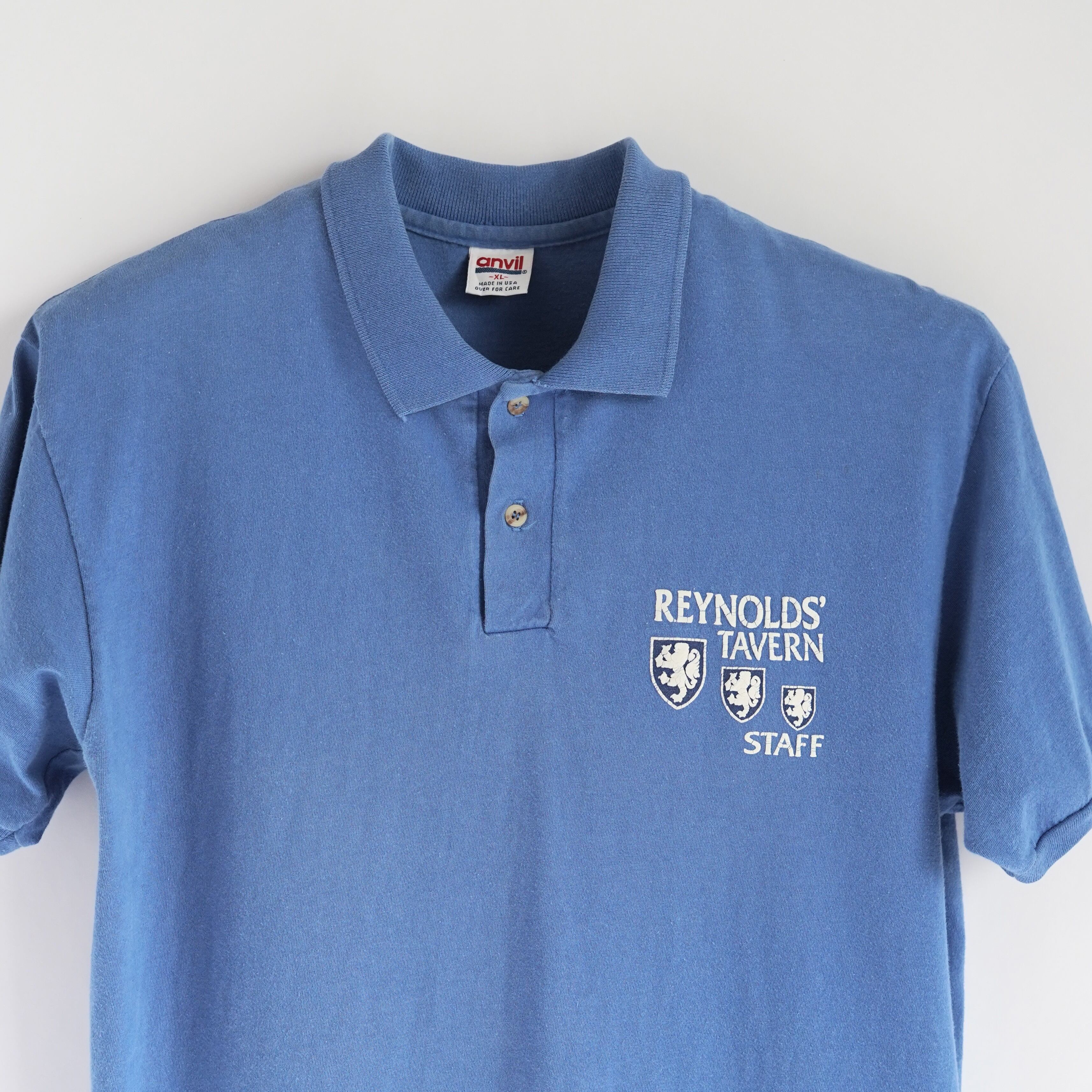 アメリカ製アンビルのポロシャツ。爽やかなブルーが印象的な、シンプルで使いやすい一枚です。サイズはXLで、かなりゆったりめのサイズ感で、大柄の方やリラックスした着こなしにぴったり。コットン素材で肌なじみがよく、古着ならではの柔らかい風合いも魅力です。胸プリントのヤレ具合も雰囲気があり、唯一無二の一枚をお探しの方におすすめです。