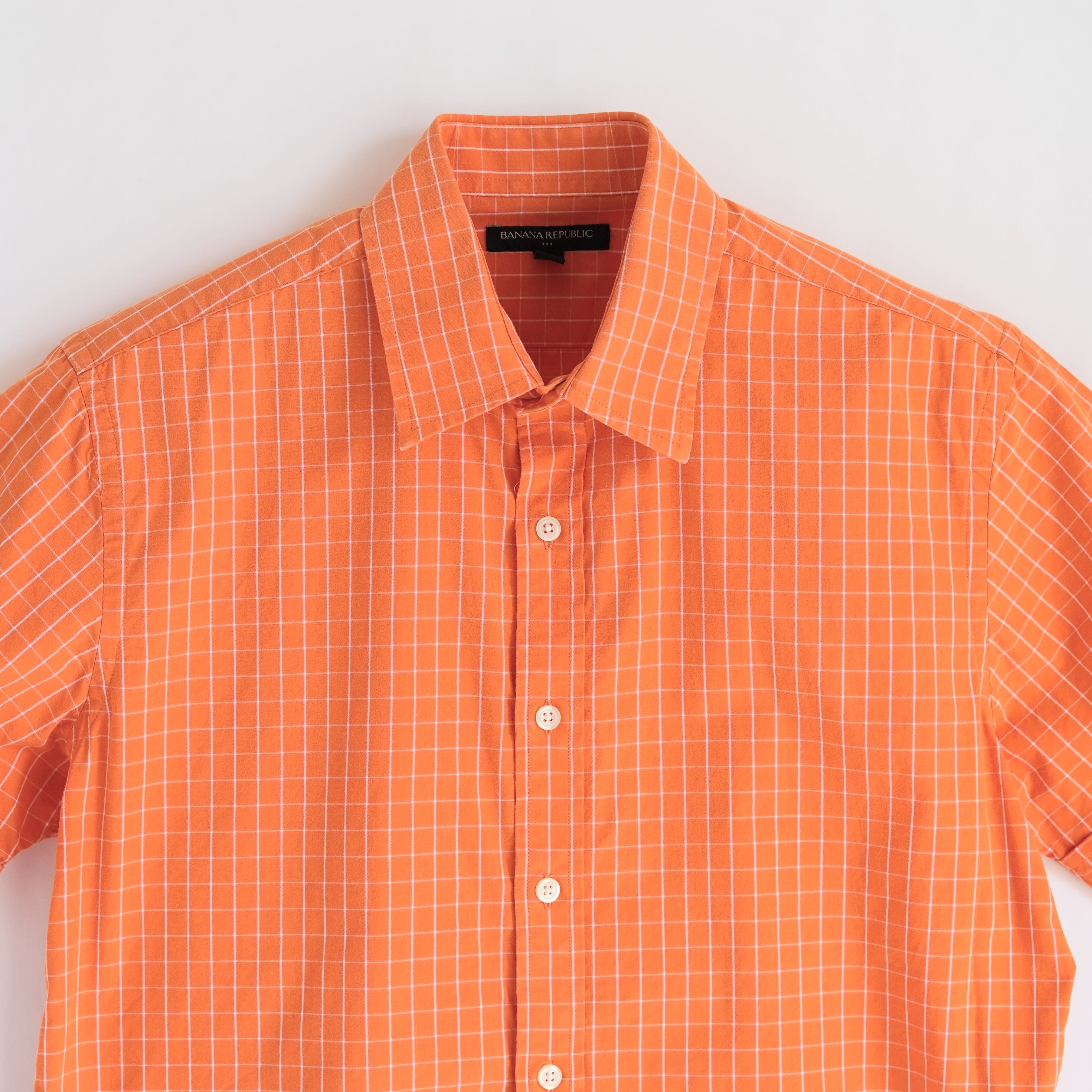 夏らしい鮮やかなオレンジチェックが目を引く、バナナリパブリックの半袖シャツ。