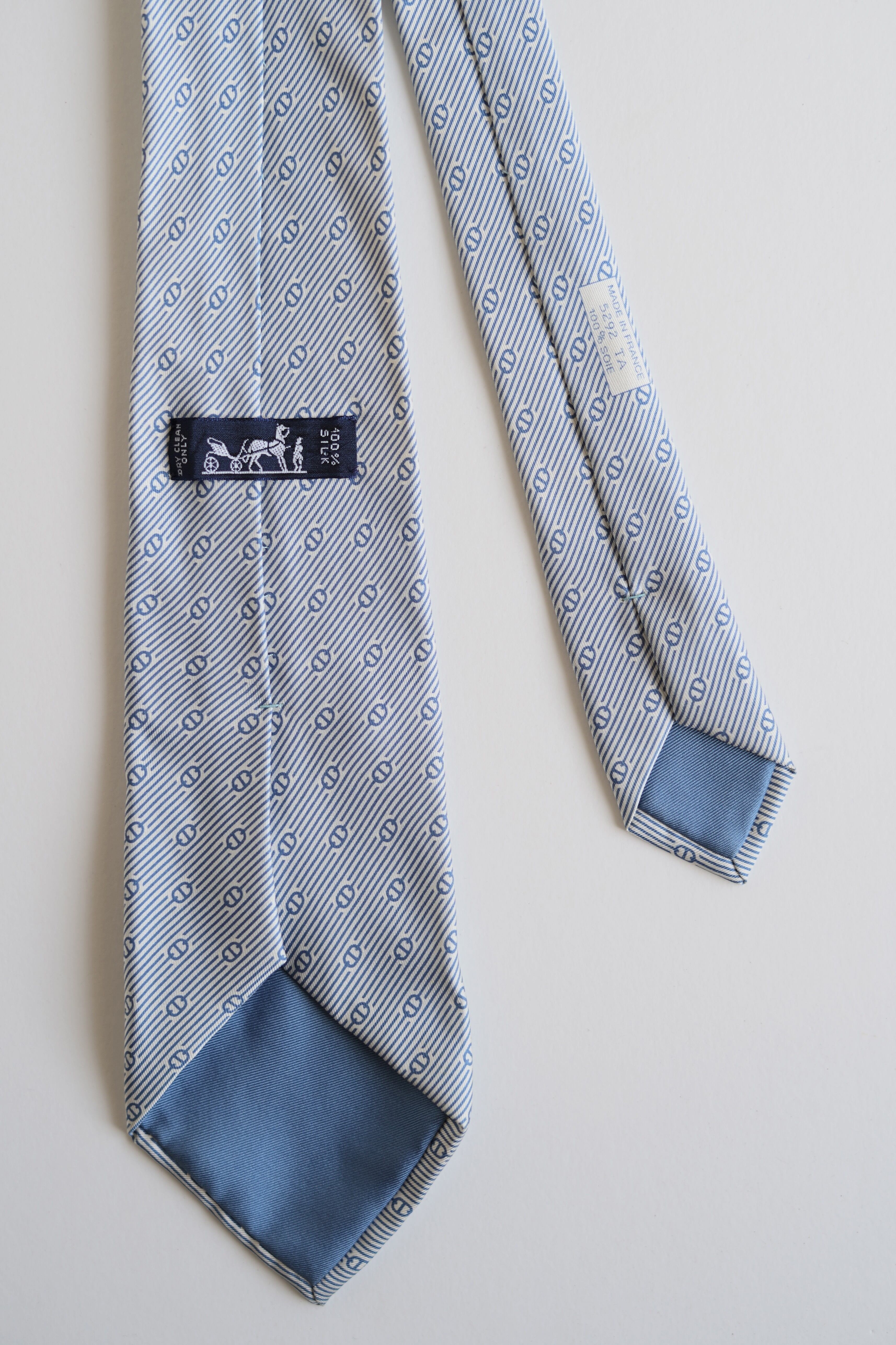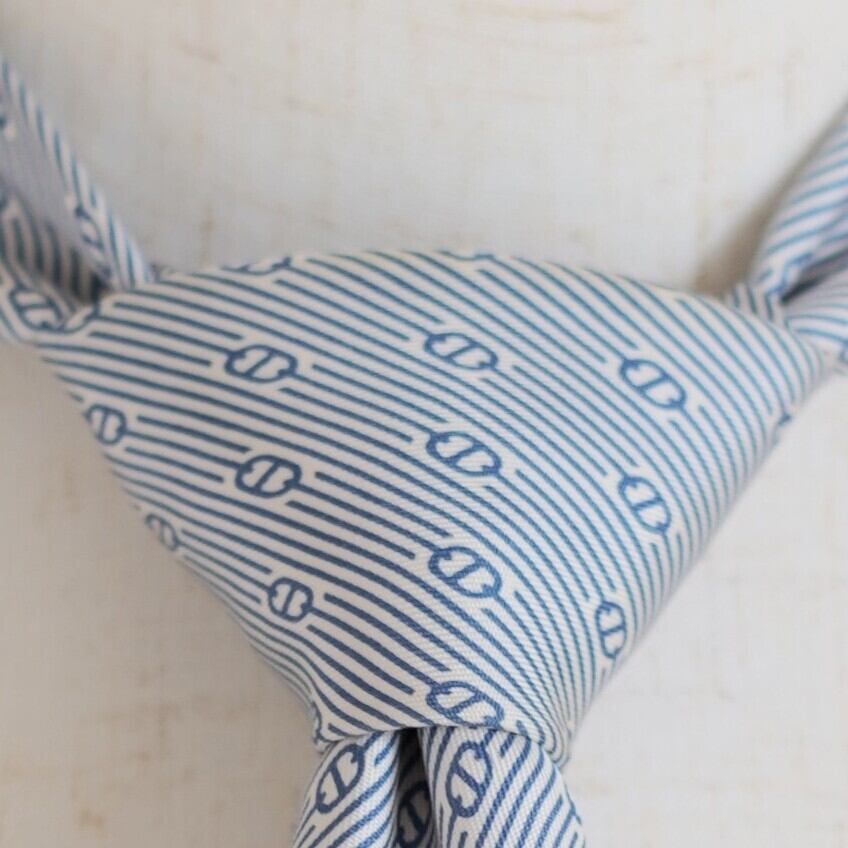 エルメスならではの洗練されたデザインが光るチェーン柄ネクタイ。爽やかなサックスブルーが上品な印象を与え、ビジネスシーンからフォーマルな場まで幅広く活躍します。高品質なシルク素材を使用し、滑らかな手触りと控えめで上品な光沢感が魅力。細部にまでこだわったディテールが、あなたの装いに格別のエレガンスをプラスします。