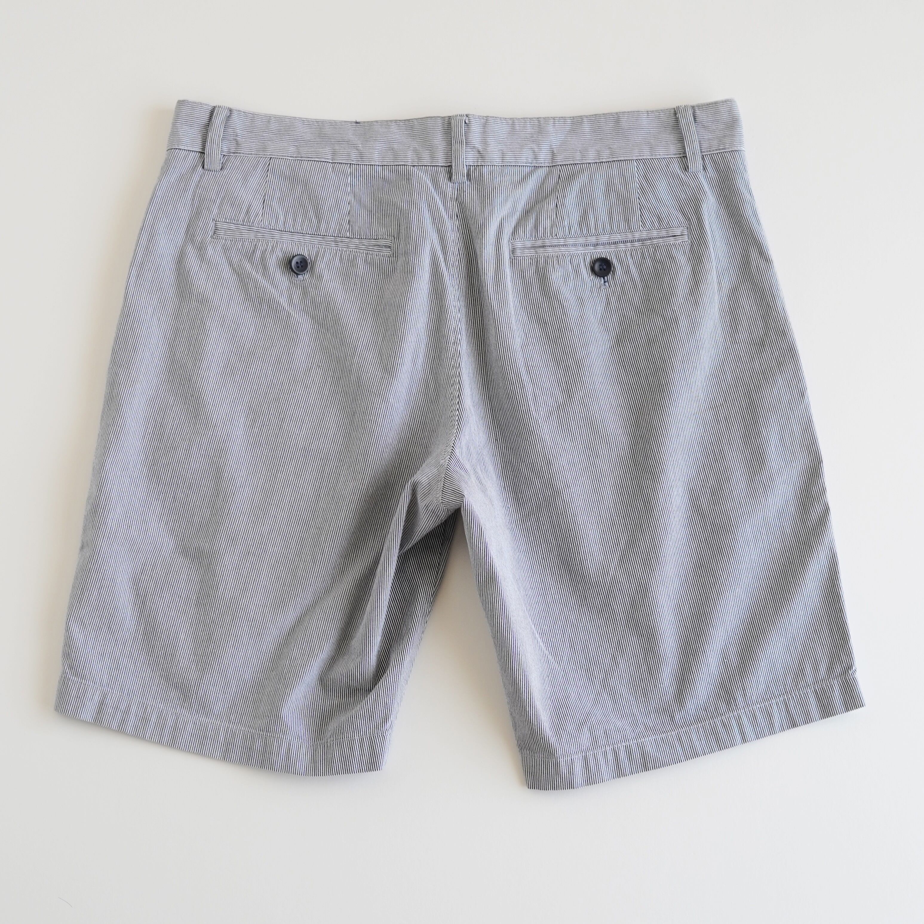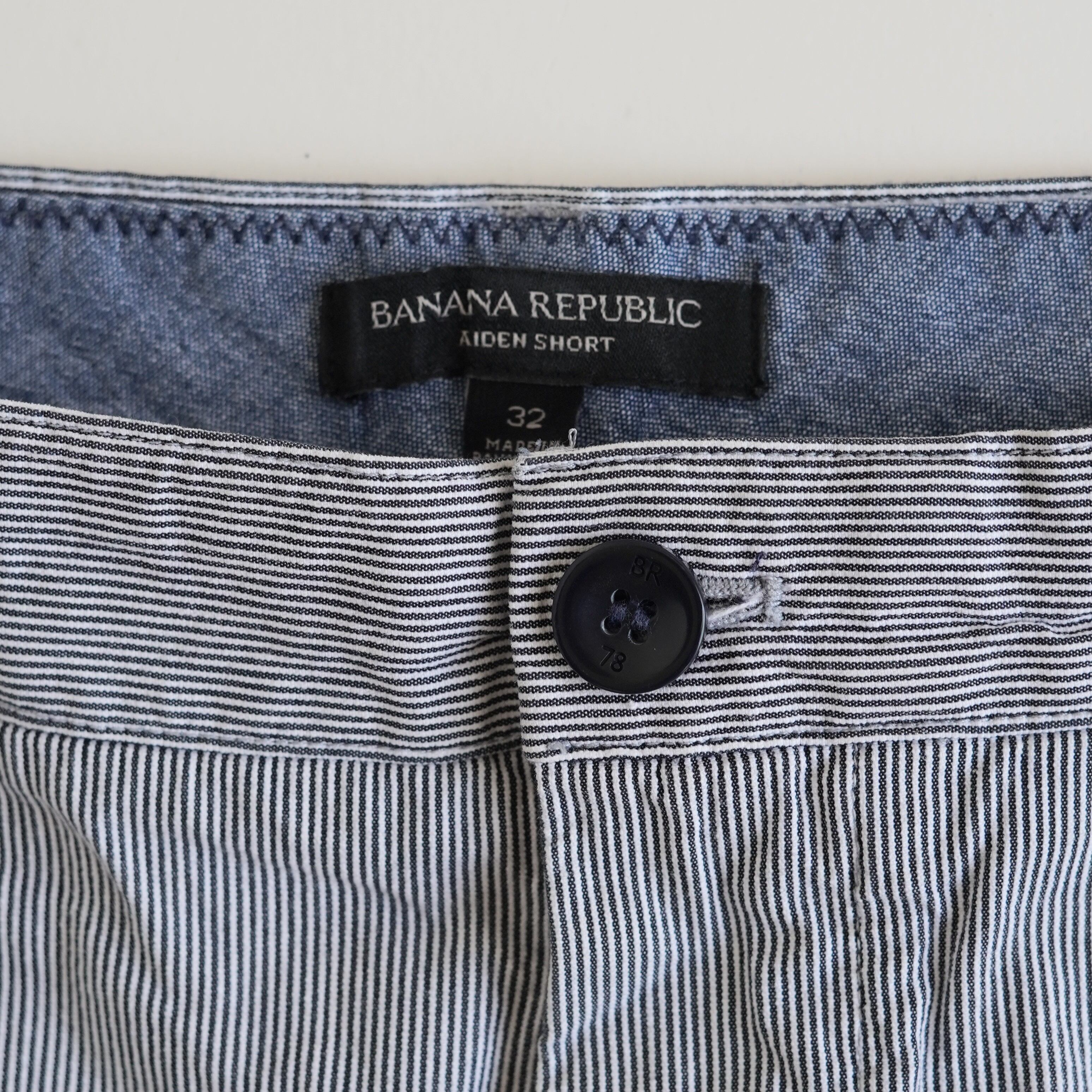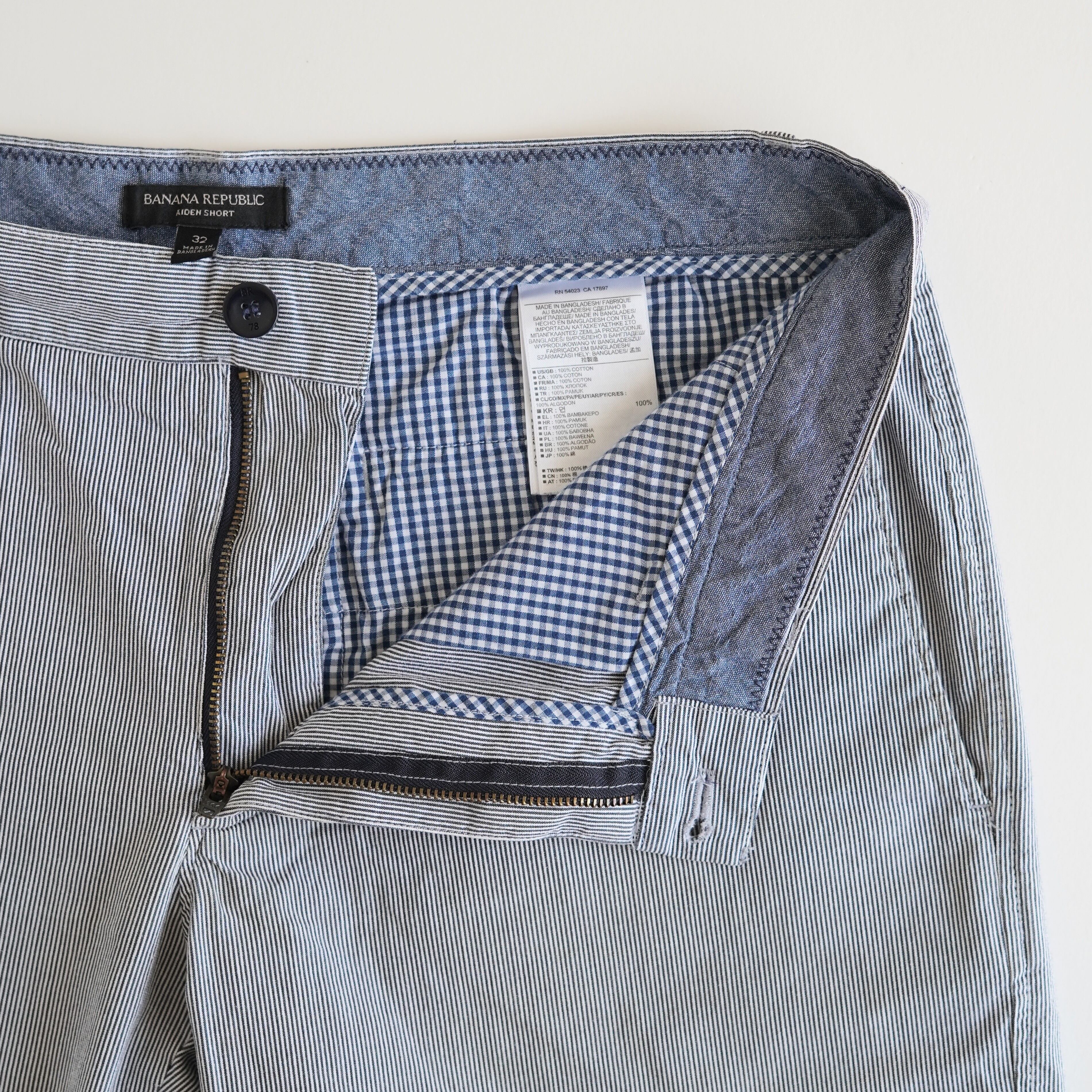 バナナリパブリックのヒッコリーストライプショートパンツ。ヒッコリー素材のの無骨さに、程よい丈感とシルエットで上品さもプラス。タウンユースやアウトドアにも幅広く活躍する、夏の「ヘビーデューティトラッド」を体現する一本です。