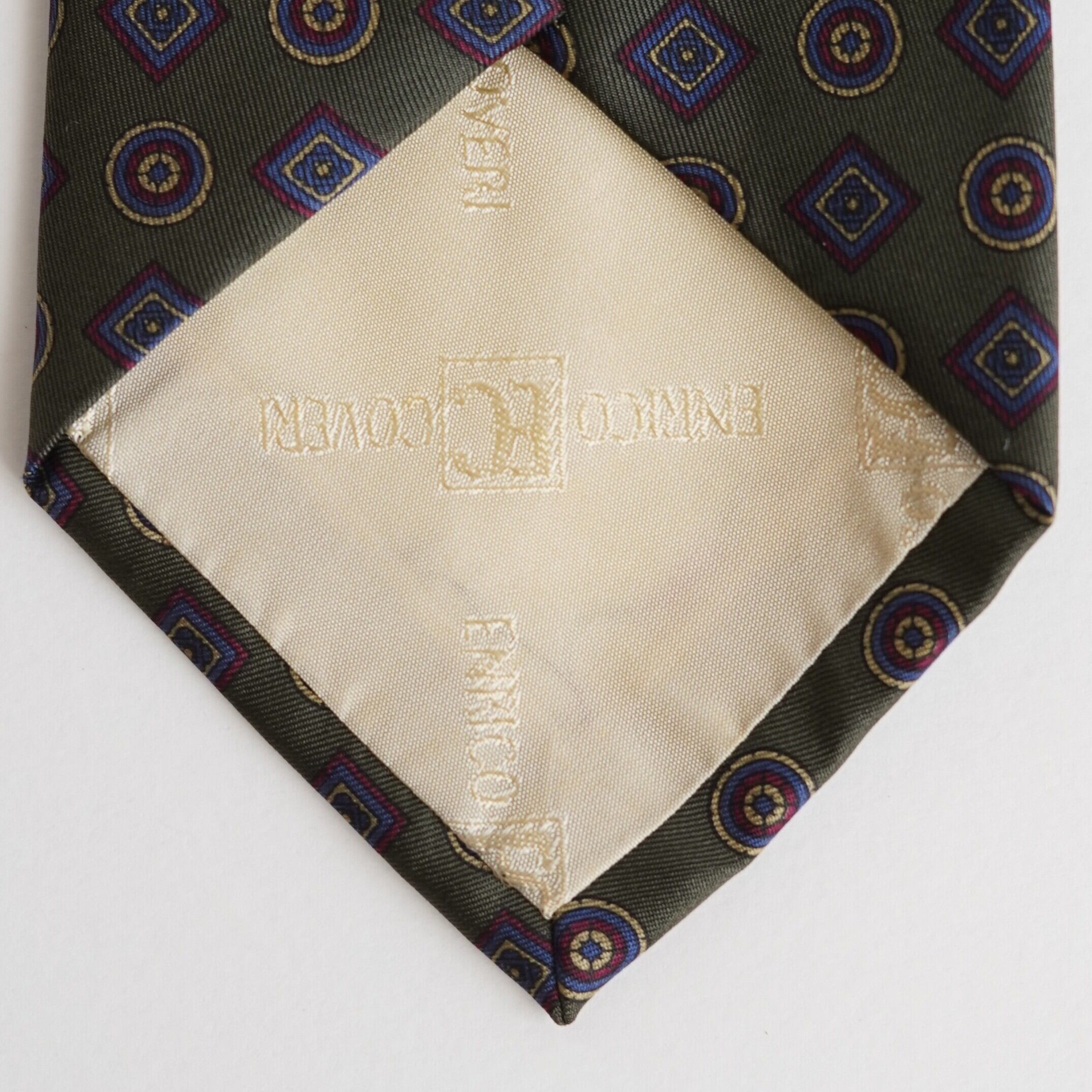 エンリコ・コベリのシルクネクタイ。落ち着いたトーンの小紋柄とオリーブグリーンの色合いが、派手さを抑えながらも存在感を放ちます。シルク特有の上質な光沢としなやかさが、結ぶたびに大人の渋みと男らしさを引き立てます。スーツスタイルに落ち着きと格を添える、洗練された男のための一本です。