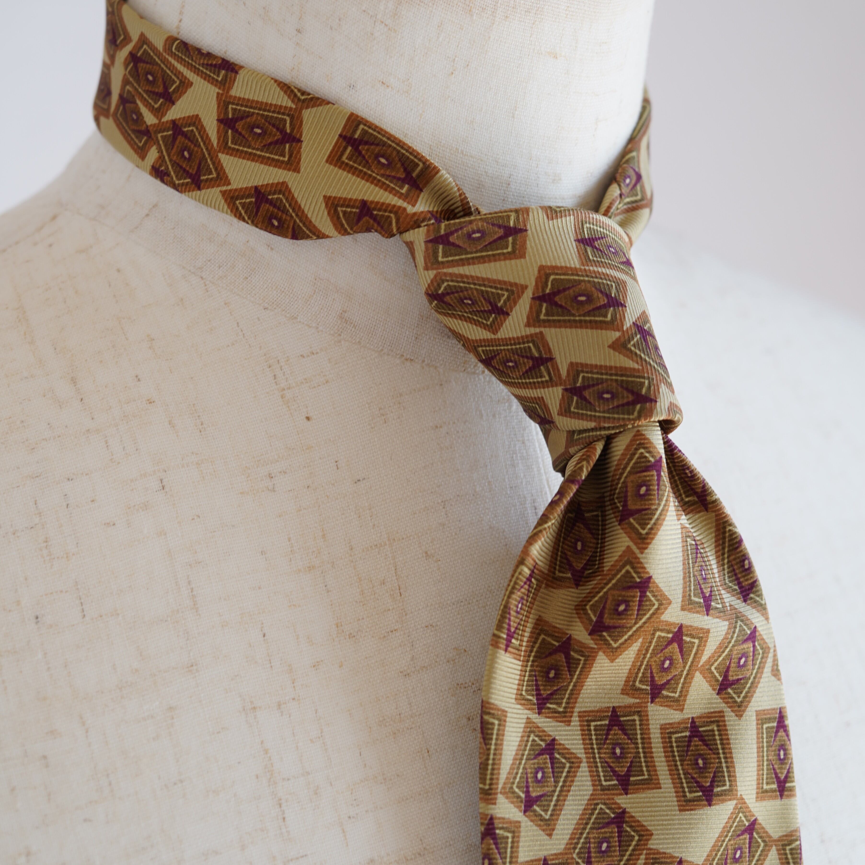 上質なシルクの光沢が柄を引き立て、ビジネスからドレスシーンまで幅広く対応。落ち着きの中に遊び心のある、大人のVゾーンを演出する一本です。