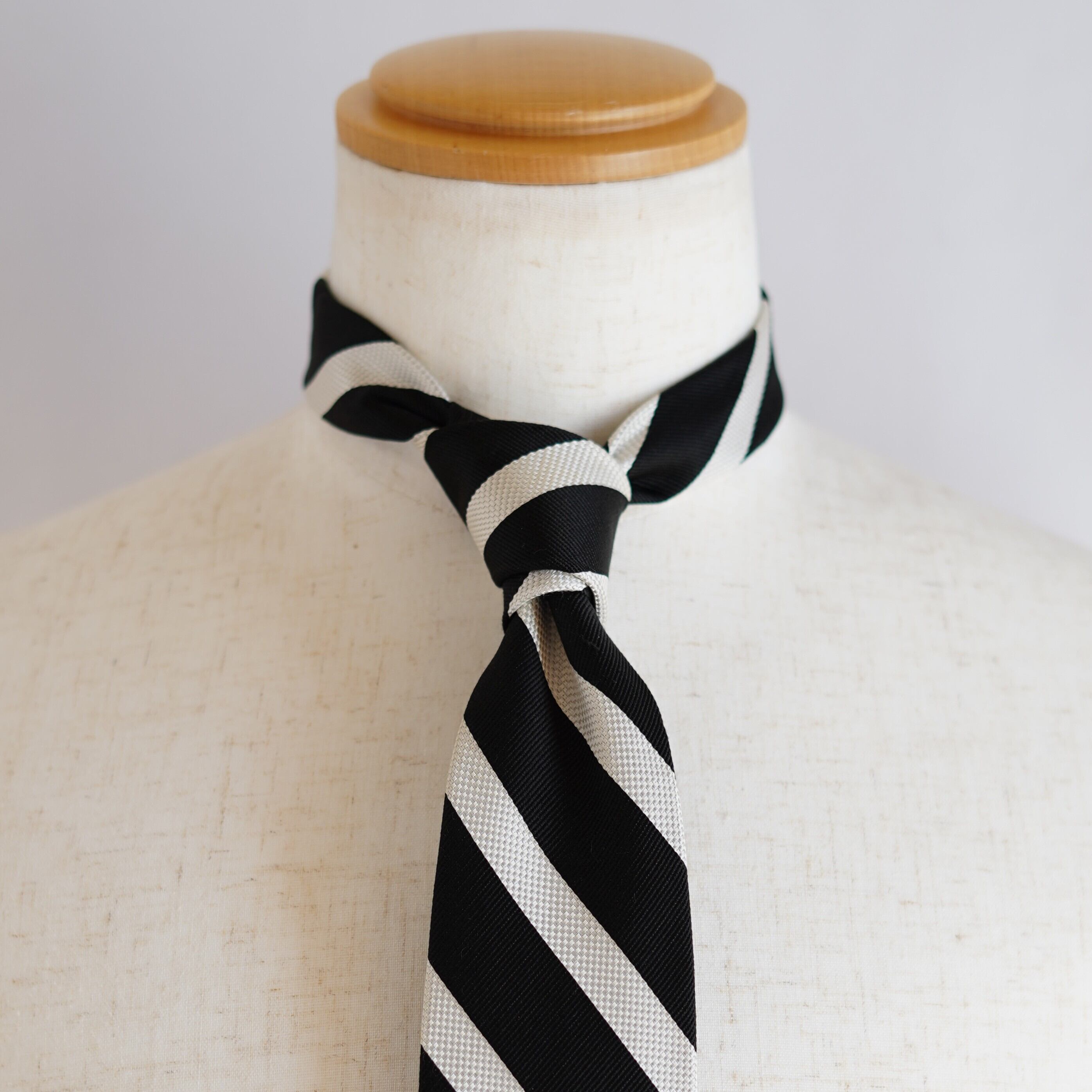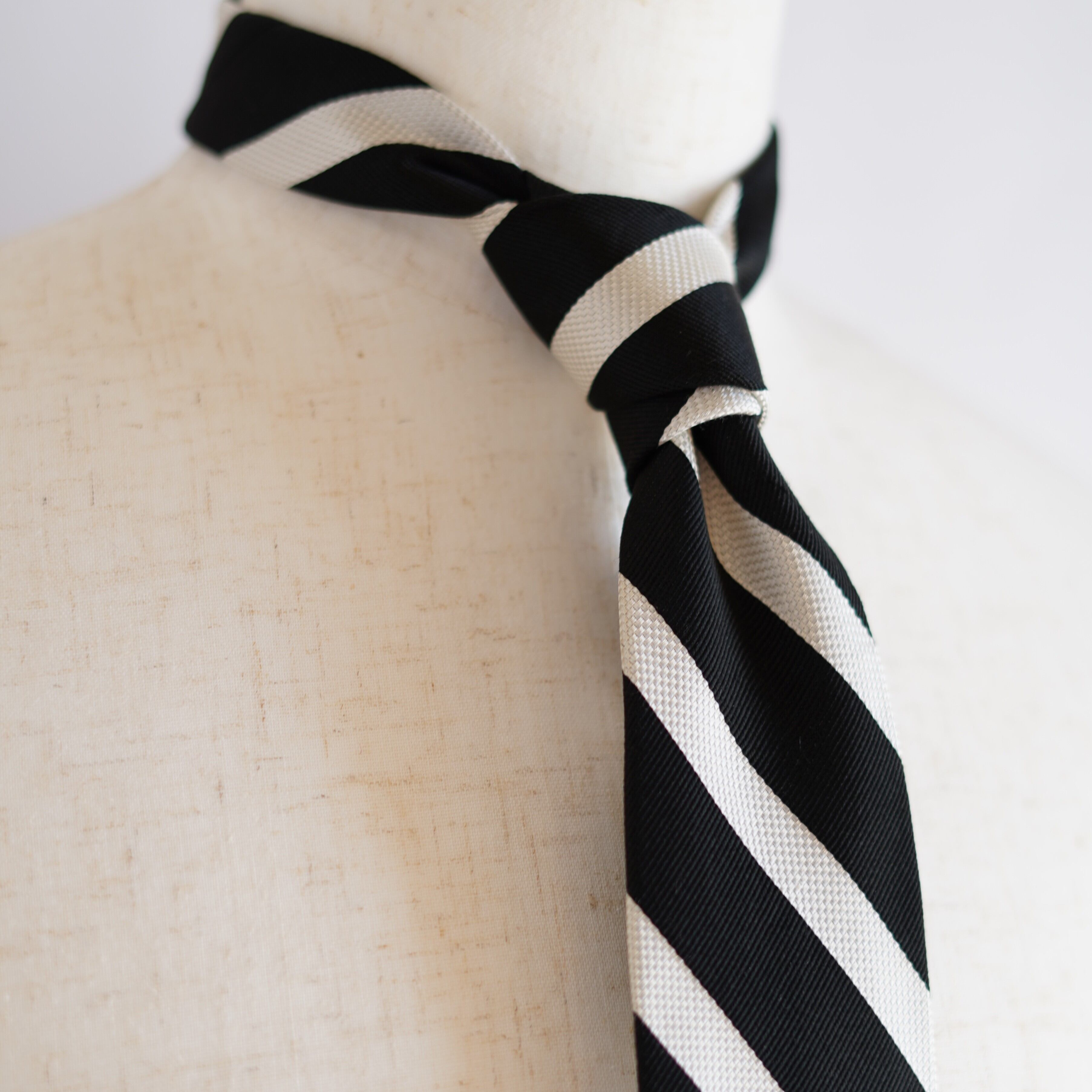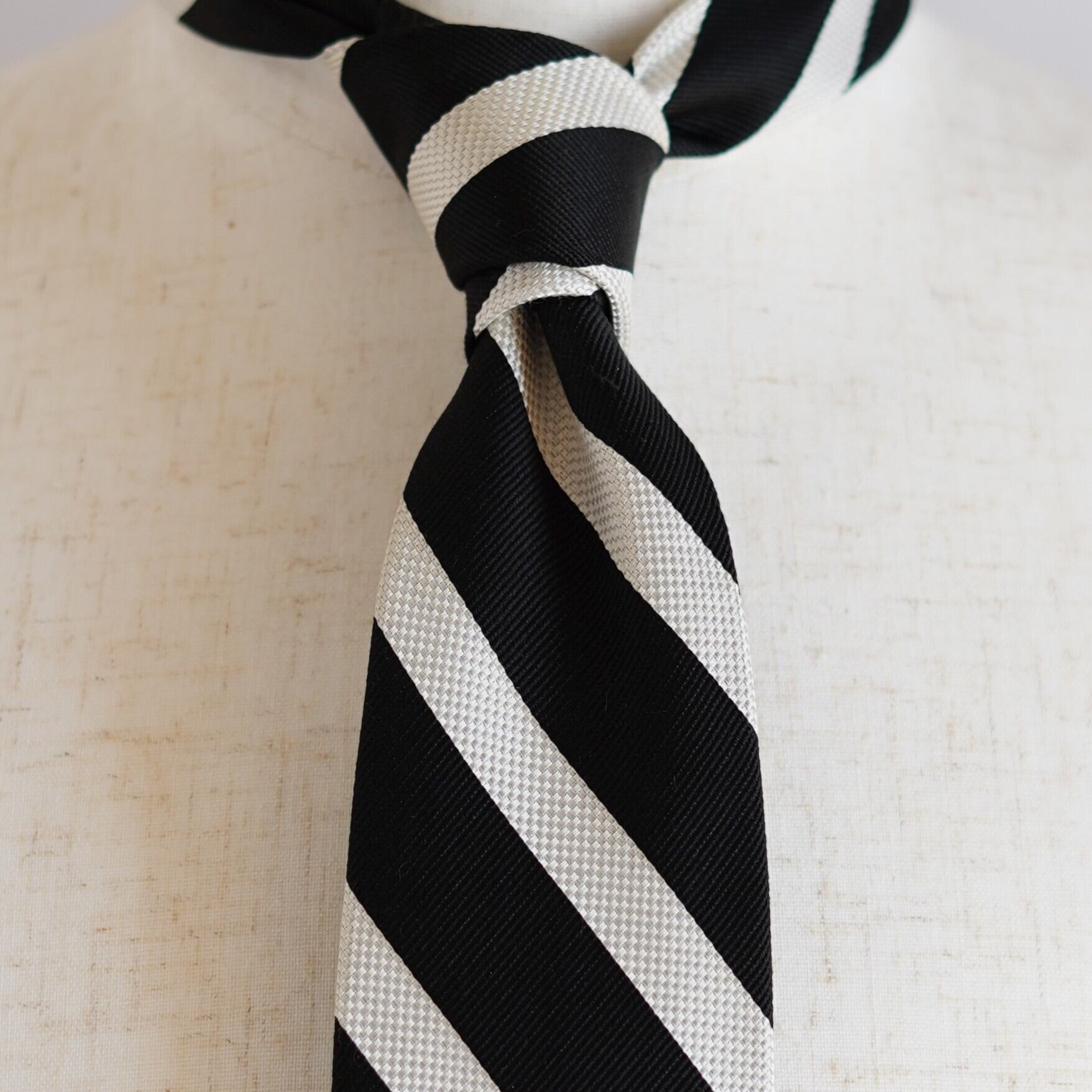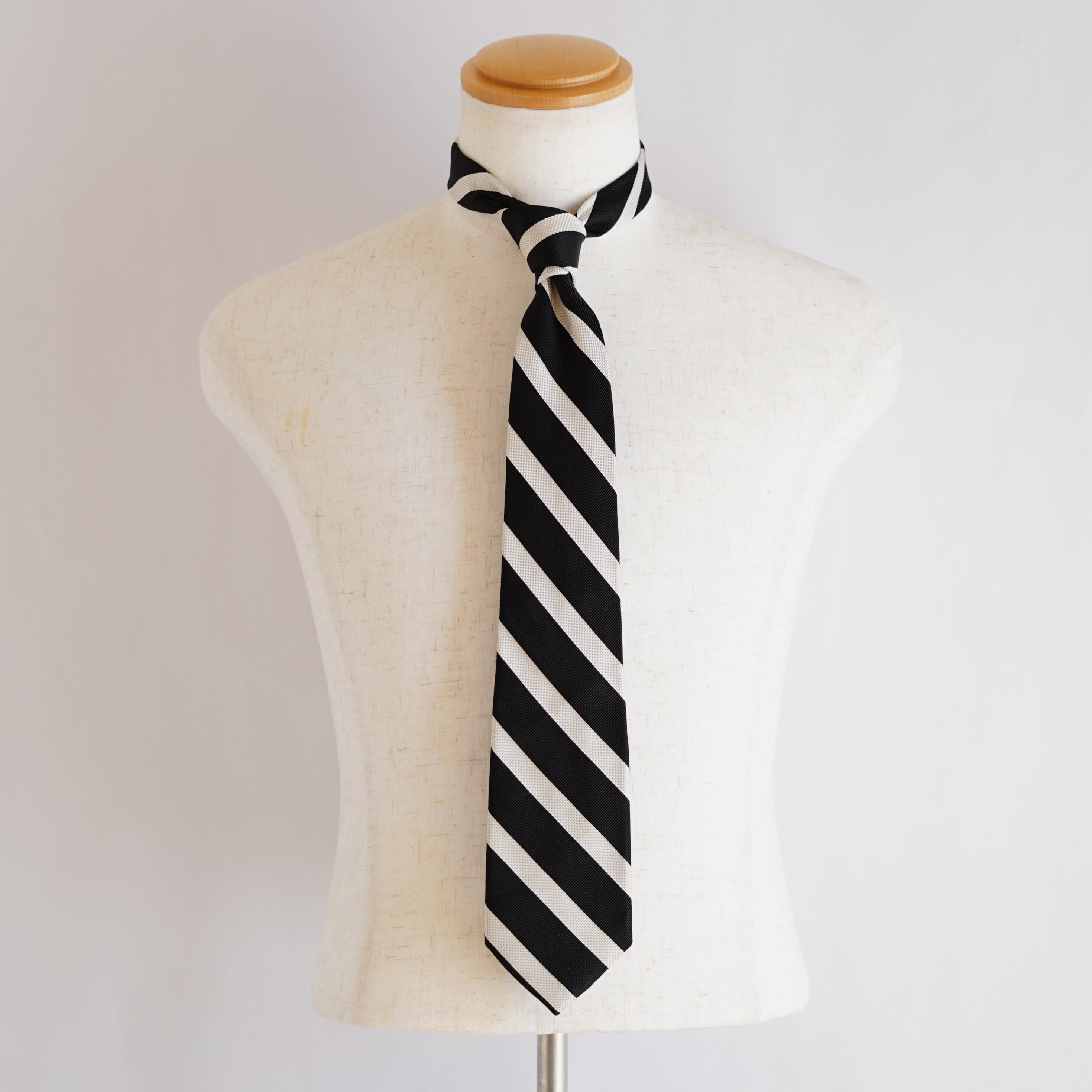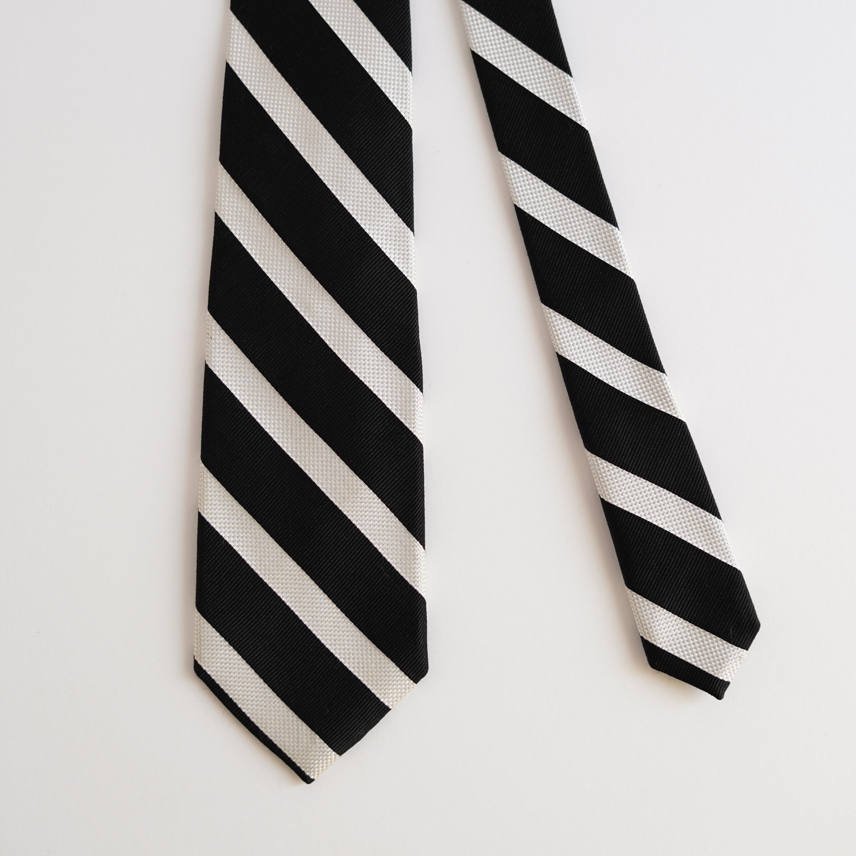 米国式をルーツとする左上がりのストライプデザインは、クラシックで知的な印象を演出。くっきりとした配色と端正な柄行きにより、ビジネスシーンからジャケットスタイルまで幅広く活躍します。国内で丁寧に仕立てられており、締め心地の良さと美しいノットも魅力。