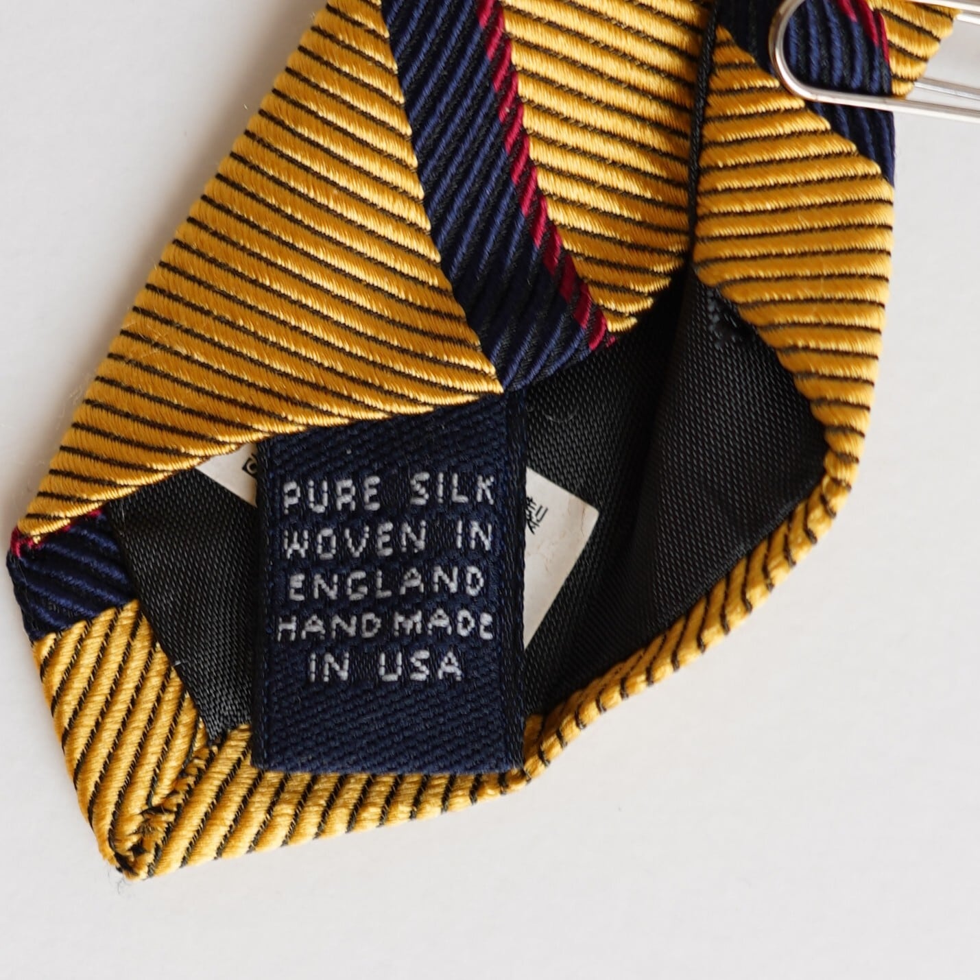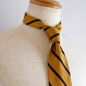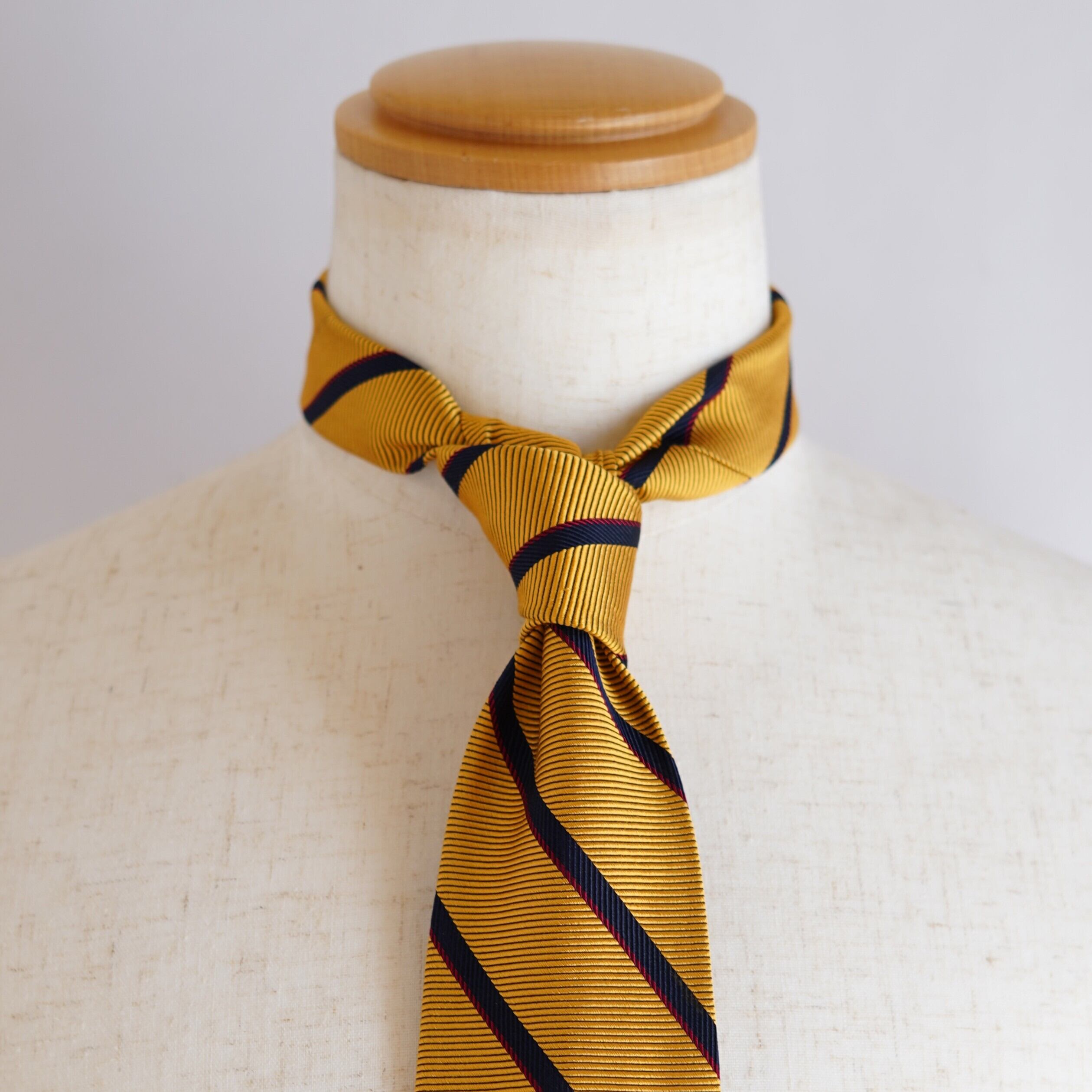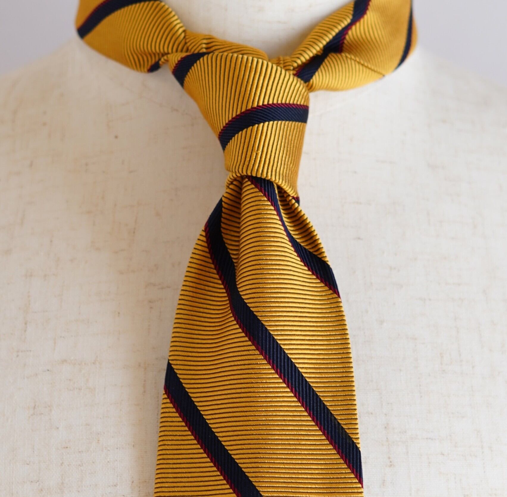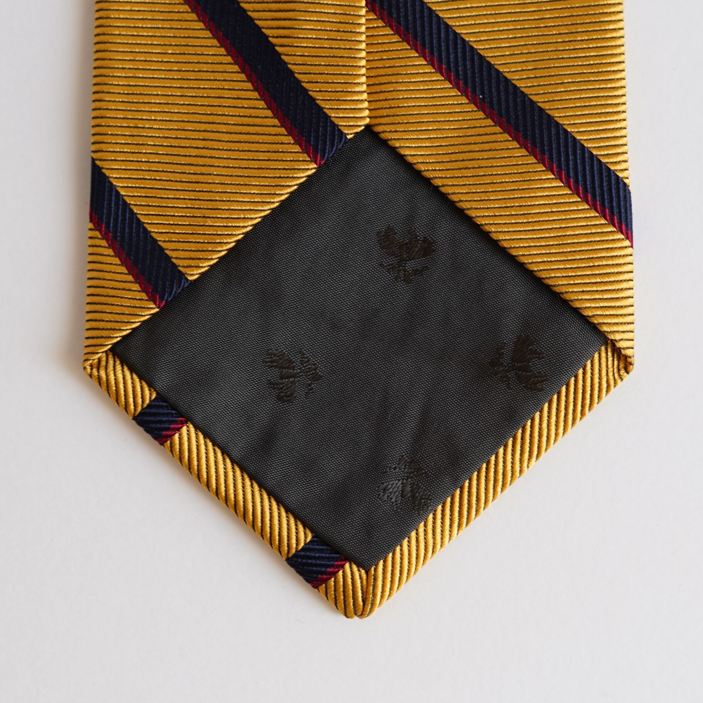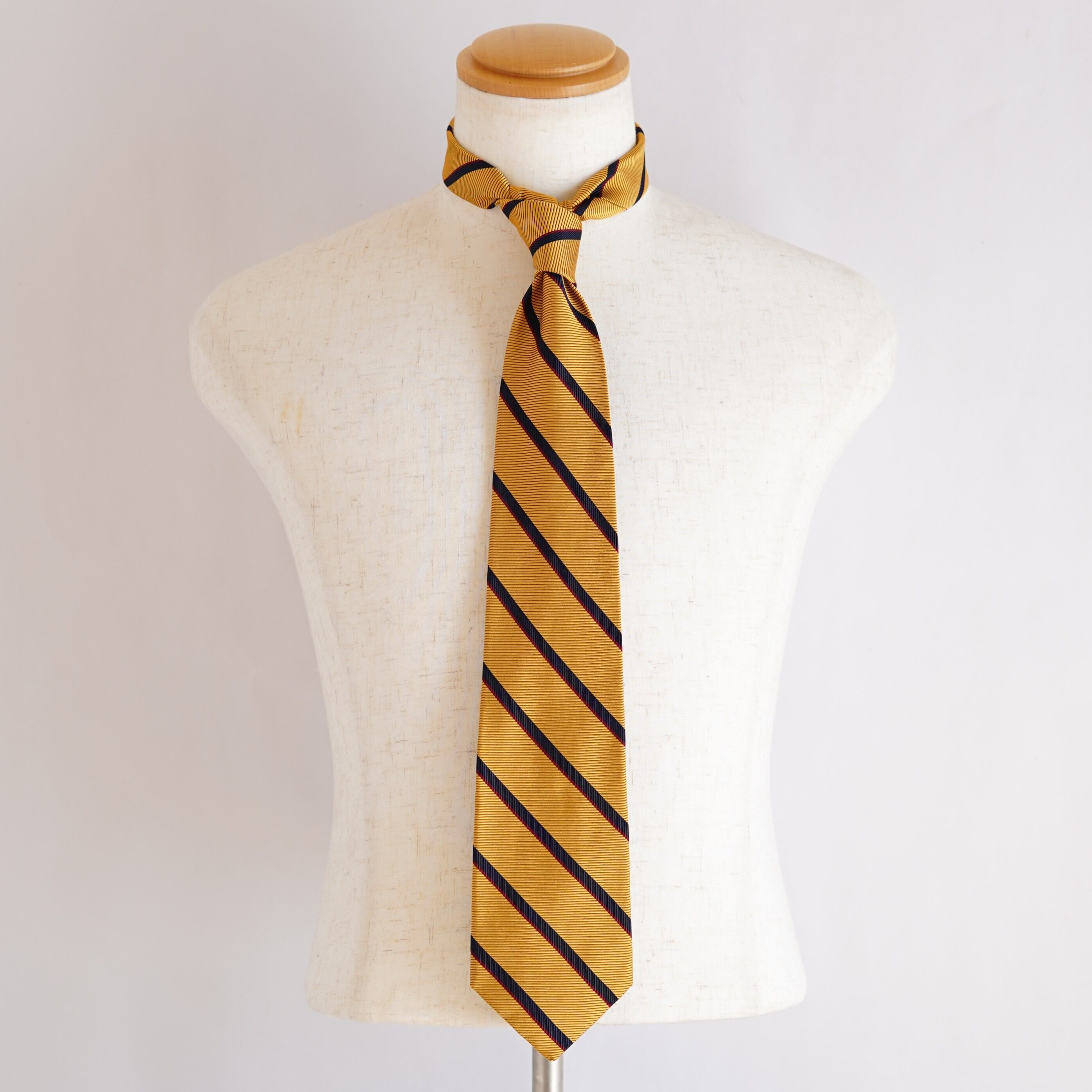 イエローゴールドの深い輝きを含んだレップストライプが、端正でありながらも華やかな存在感を放ちます。上質な素材感と計算された配色により、落ち着きの中に確かな品格を感じさせる一本に仕上がっています。