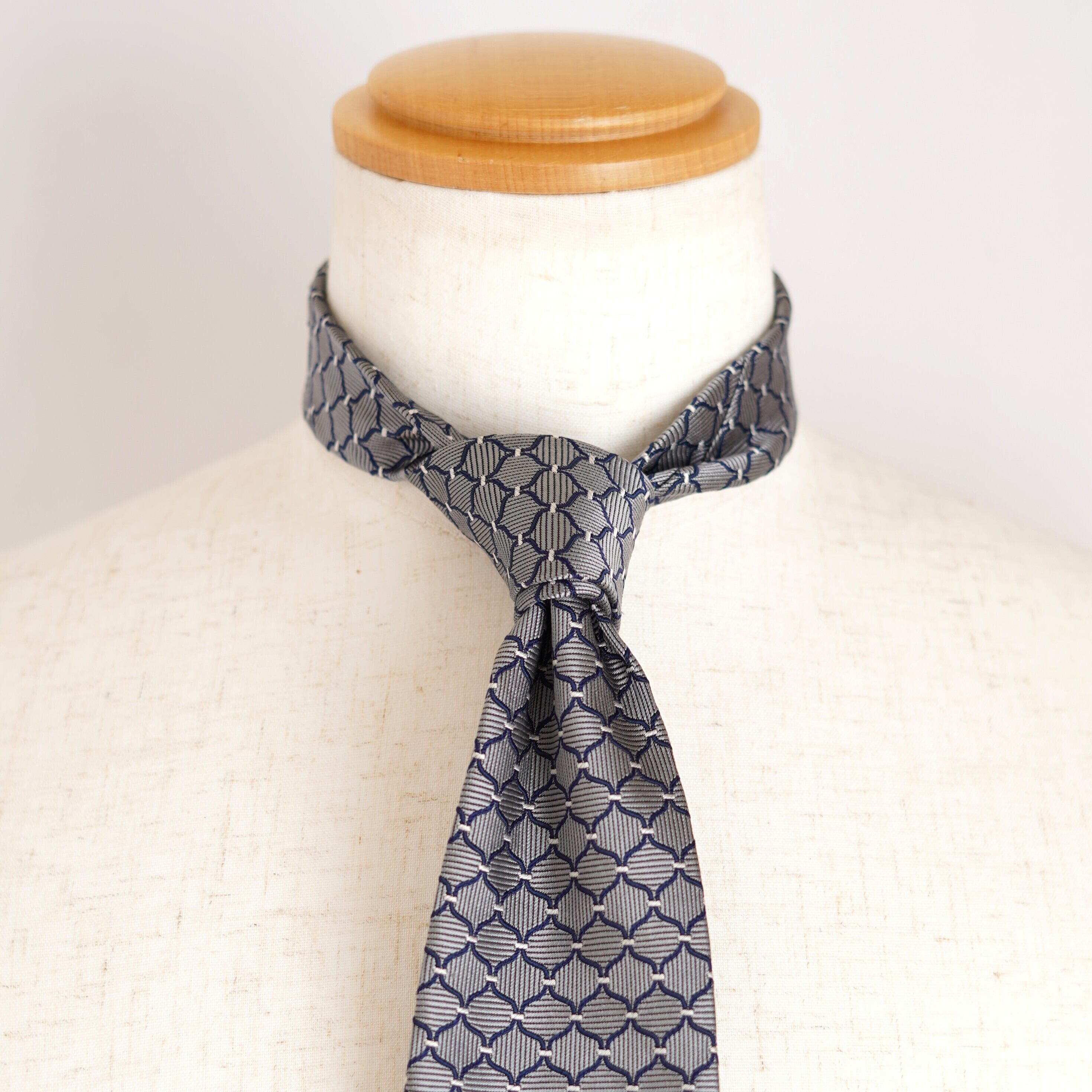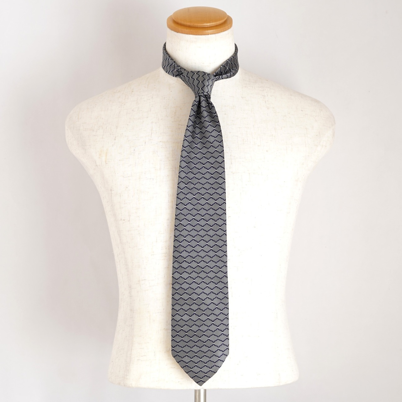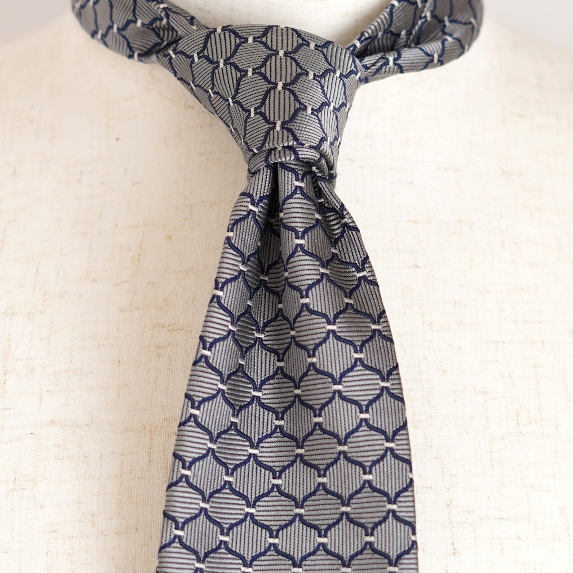 規則正しく配された幾何学柄が、知的で洗練された印象を与え、装いにさりげない表情を添えます。素材には上質なシルクを100%使用し、オールシルクならではの滑らかな質感と、品の良い控えめな光沢が魅力。