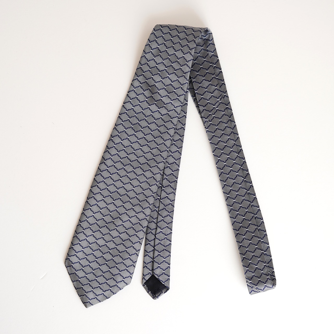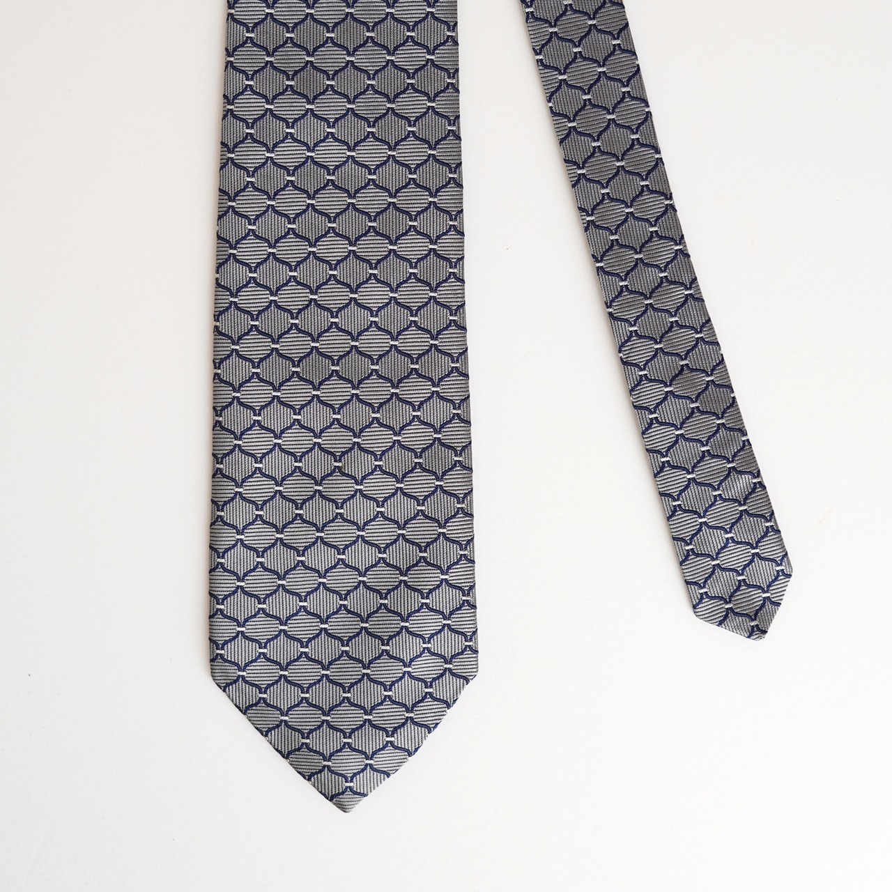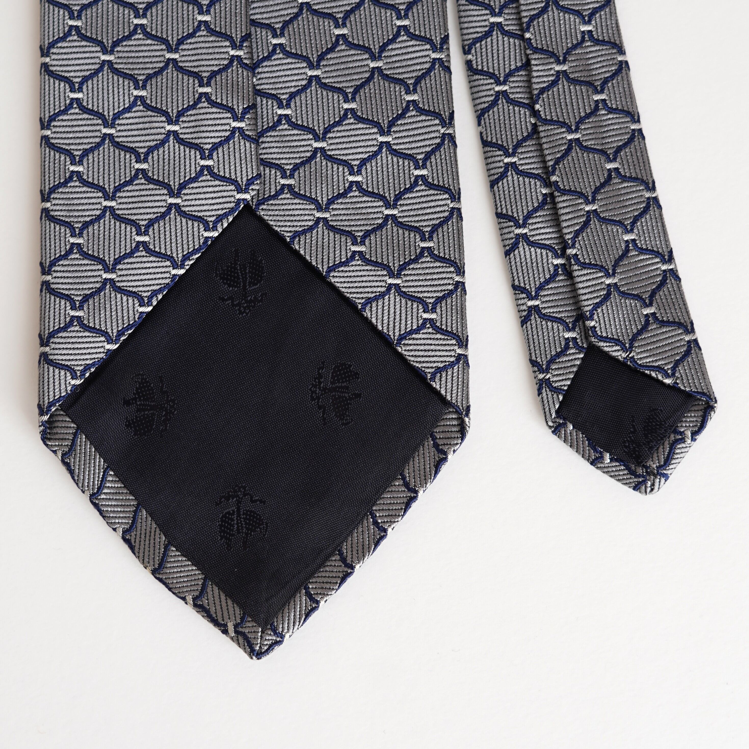 規則正しく配された幾何学柄が、知的で洗練された印象を与え、装いにさりげない表情を添えます。素材には上質なシルクを100%使用し、オールシルクならではの滑らかな質感と、品の良い控えめな光沢が魅力。