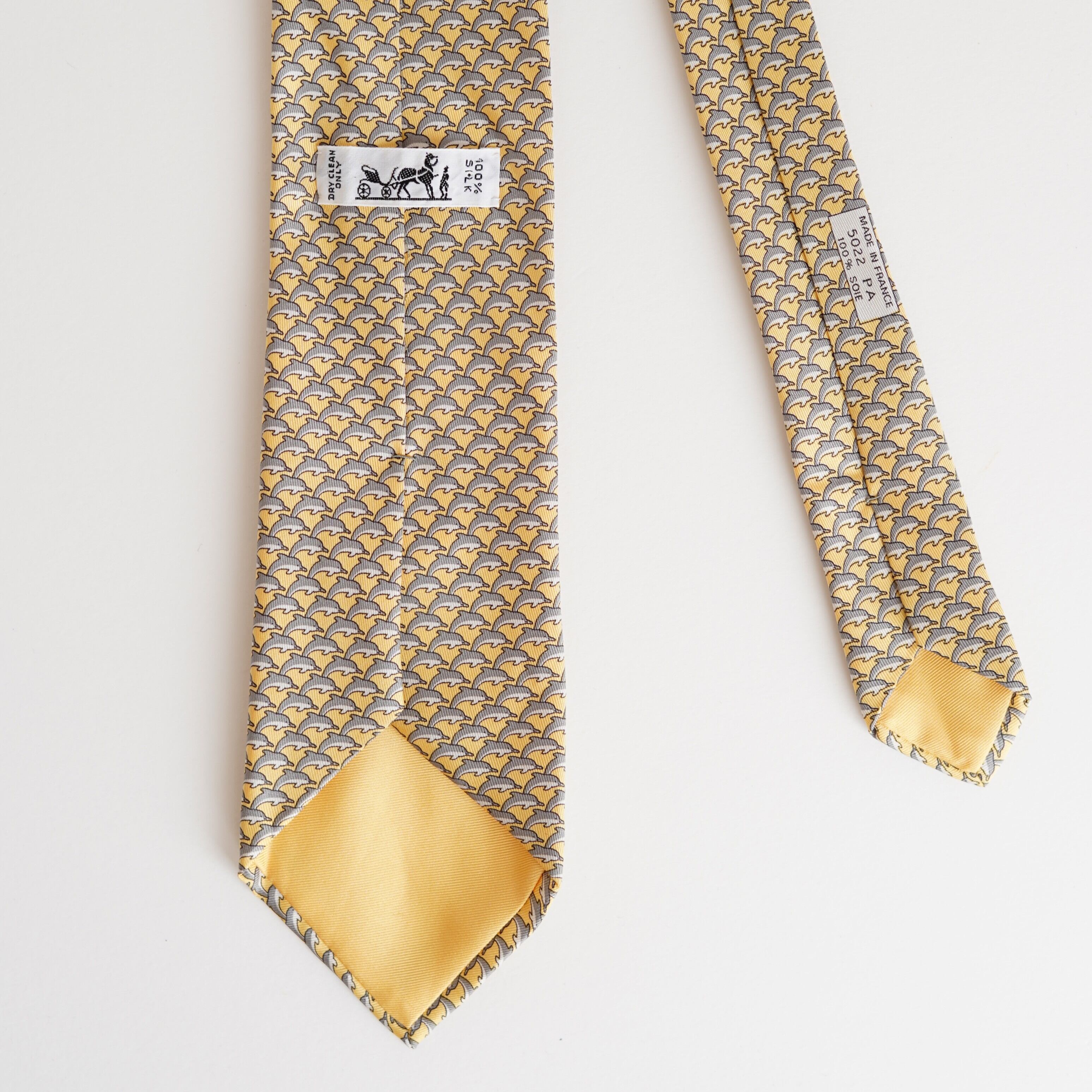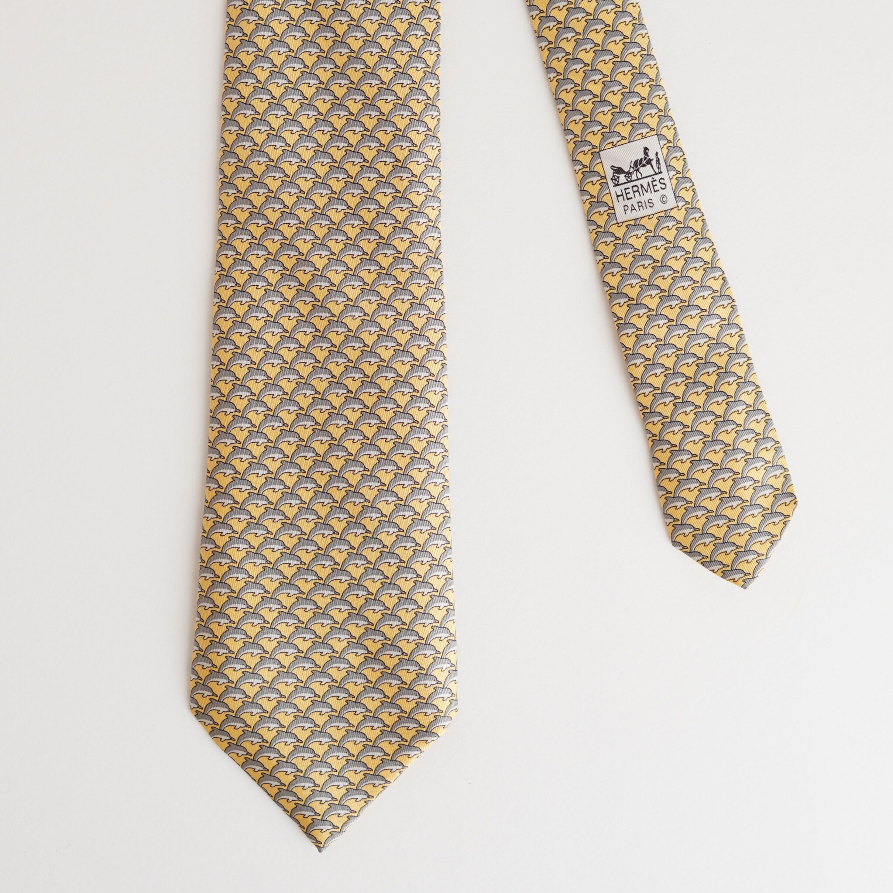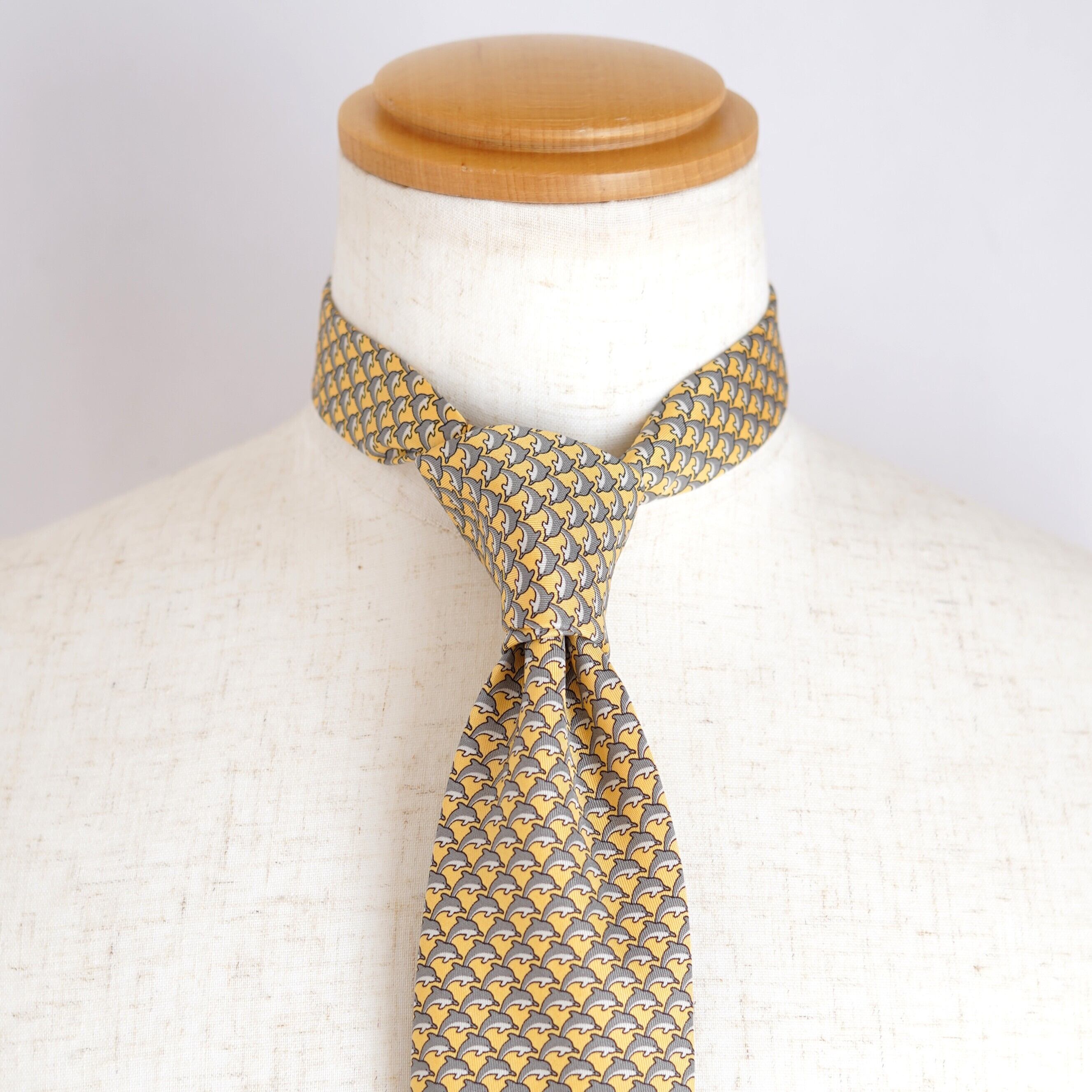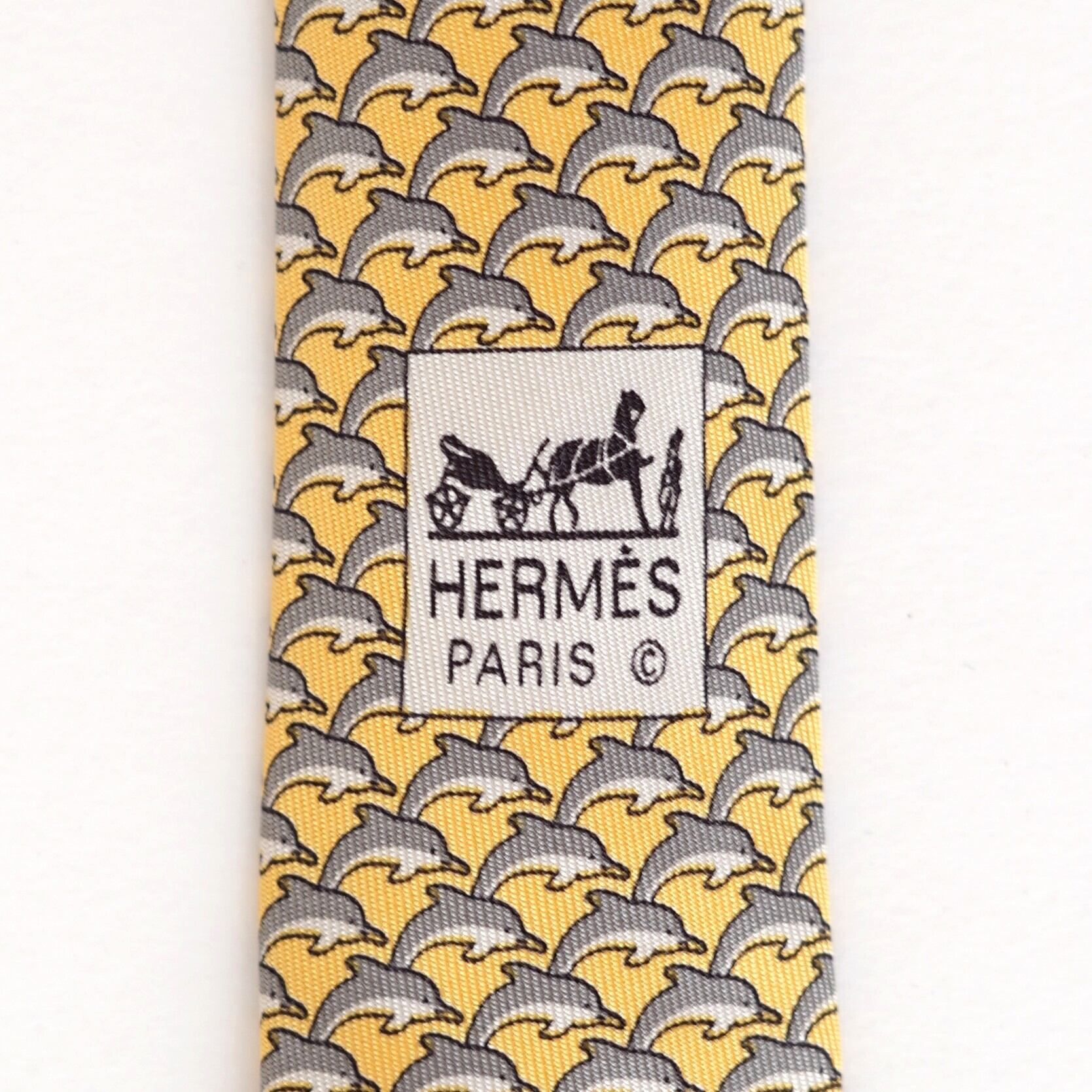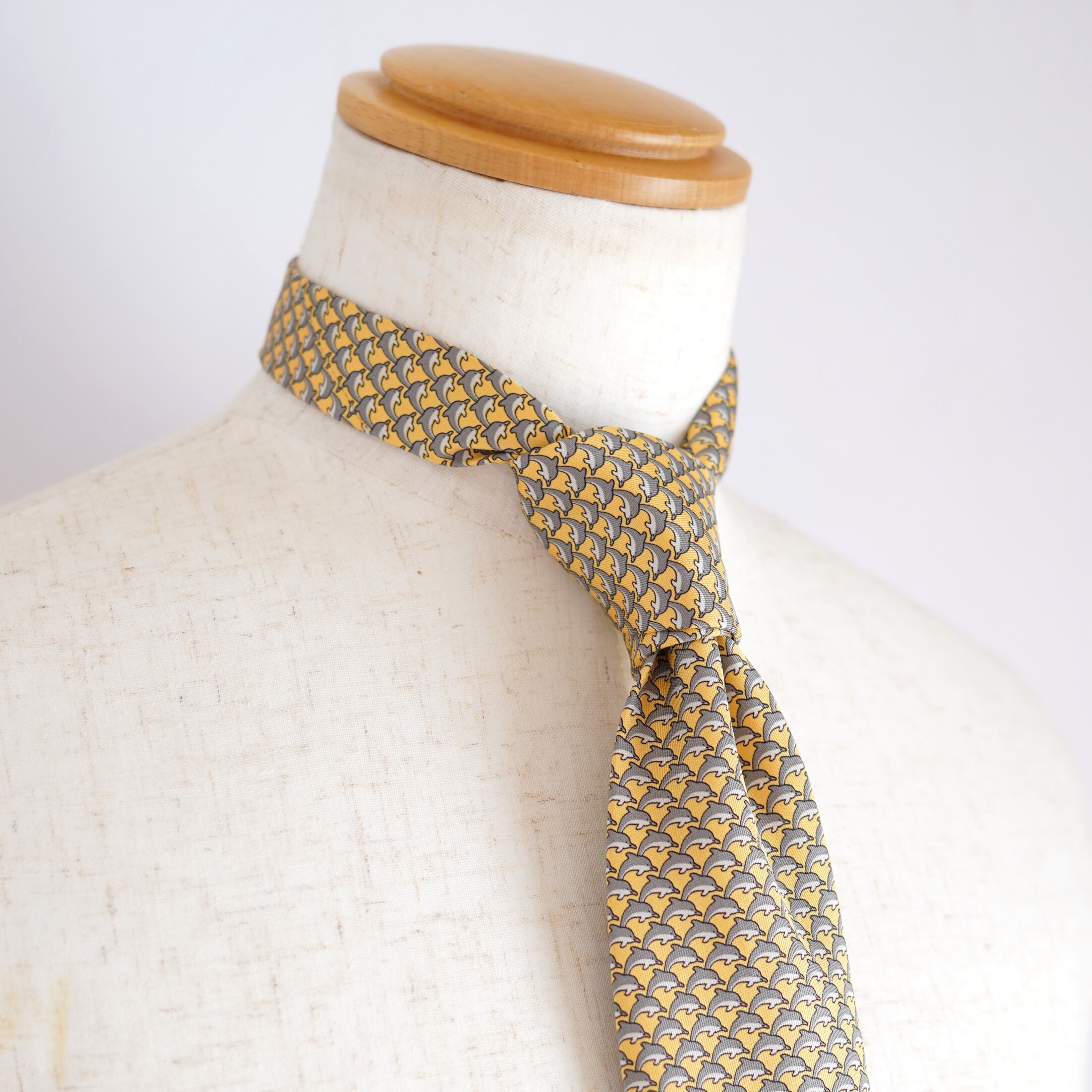 エルメスならではの遊び心と品格が調和した、イルカモチーフの総柄シルクタイ。