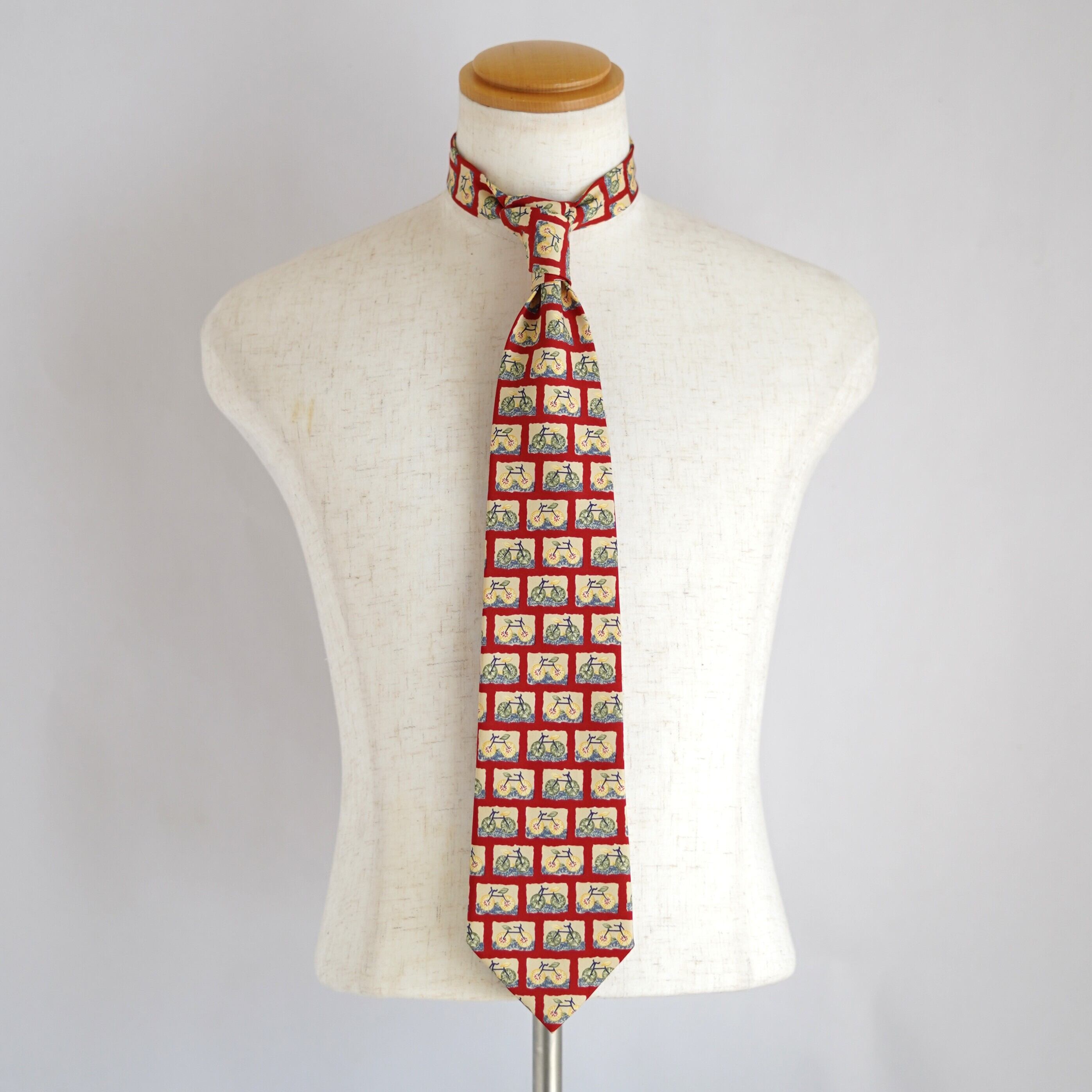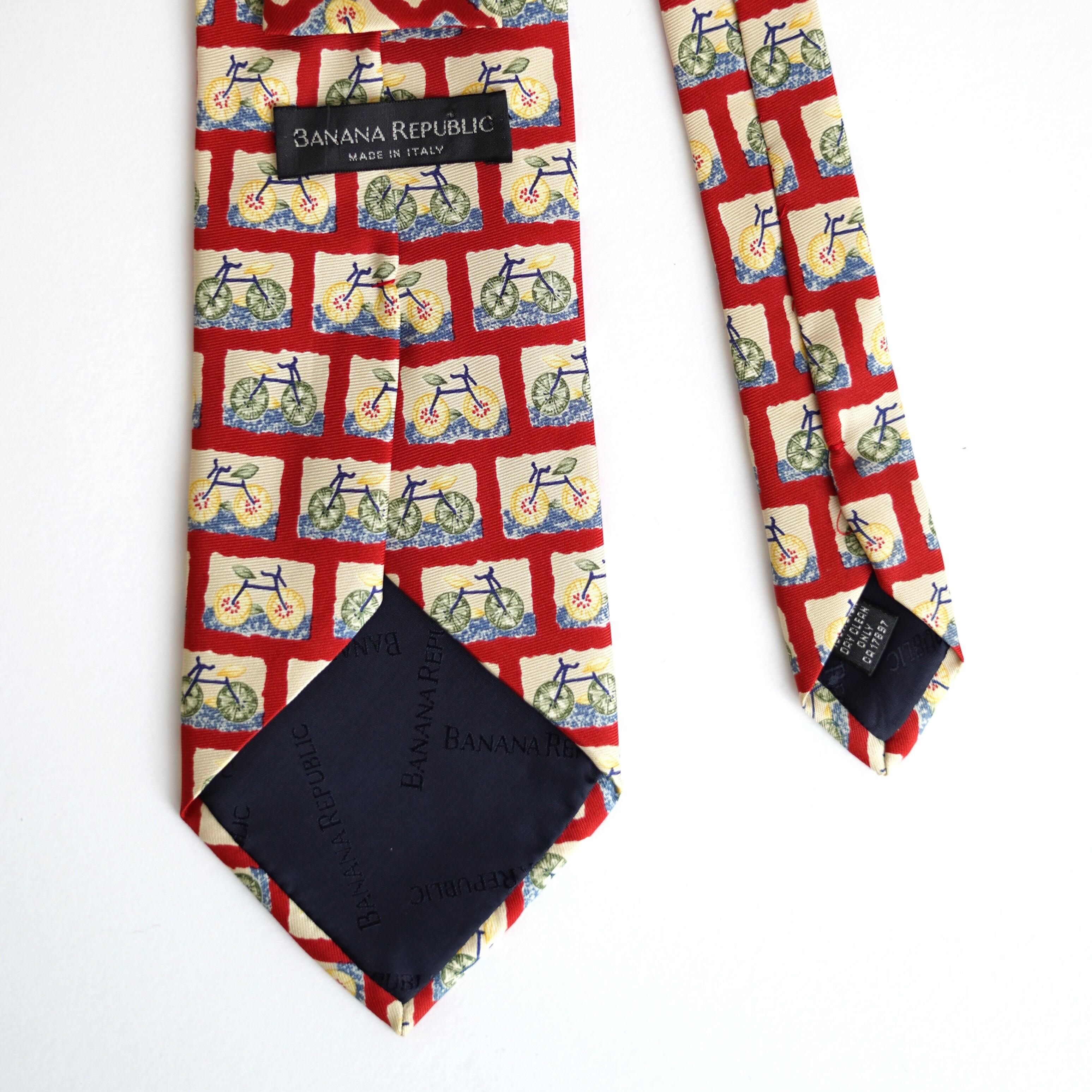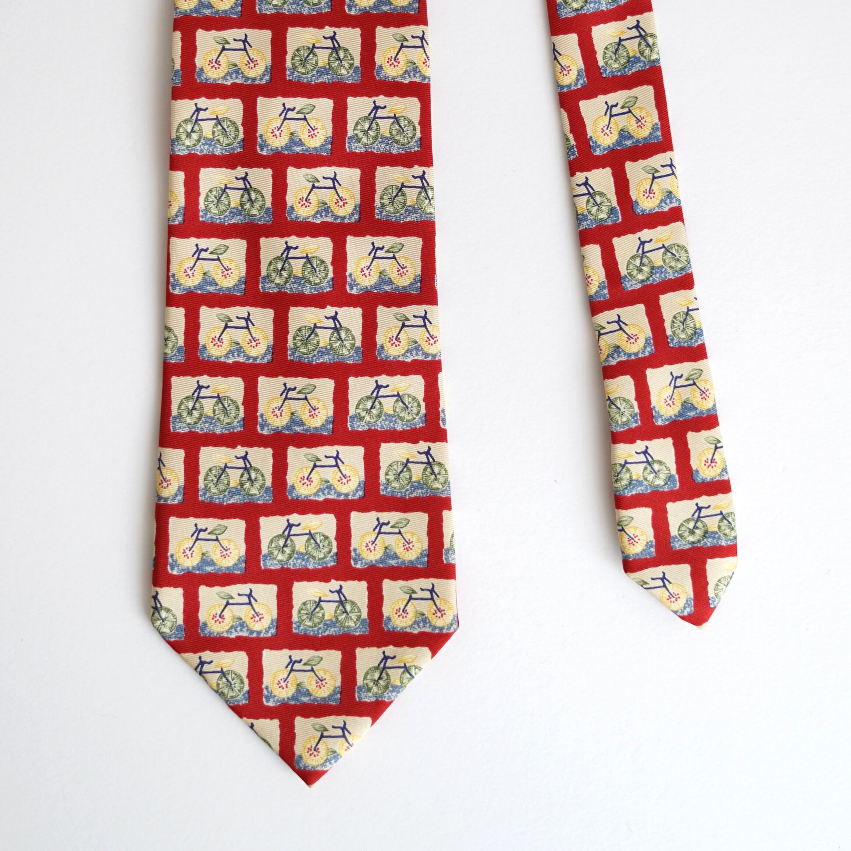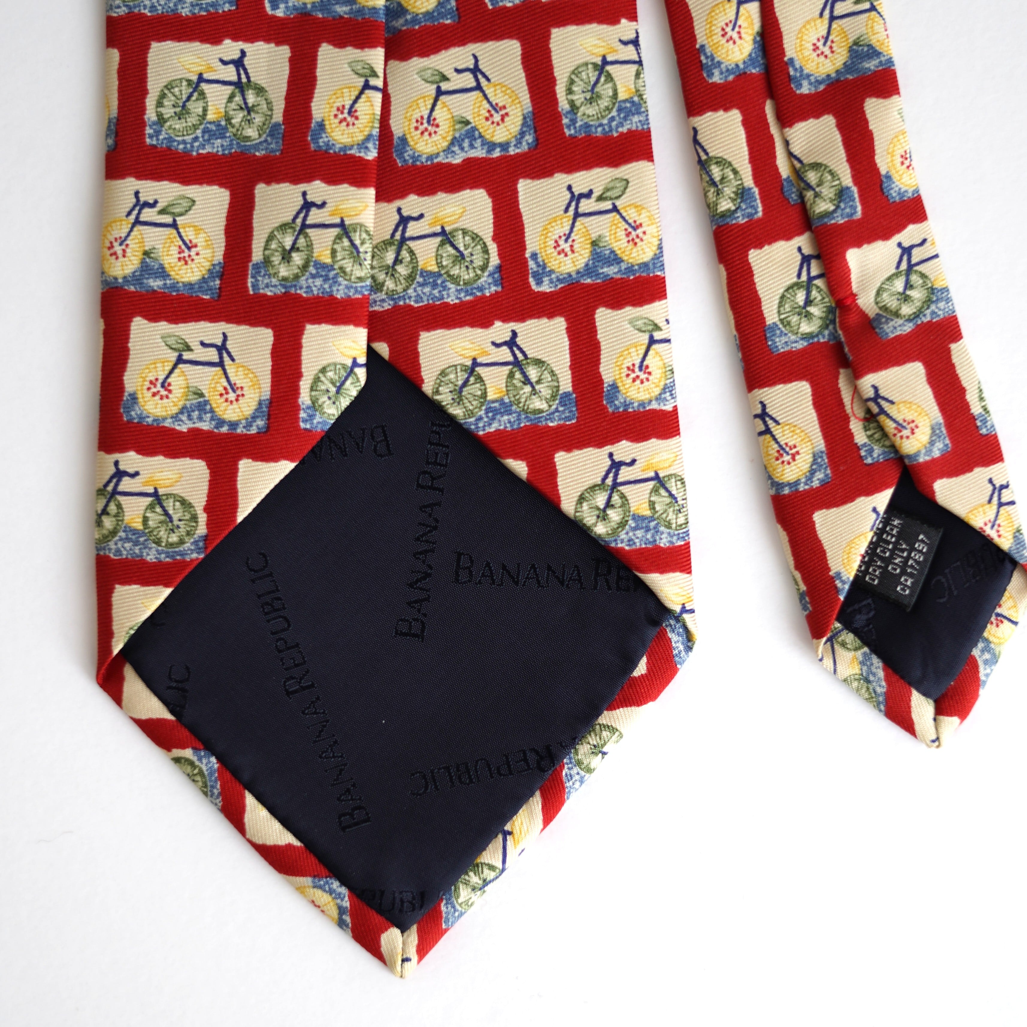 自転車という意外性のあるモチーフを大胆に散りばめた、バナナ・リパブリックのユーモラスなネクタイ。