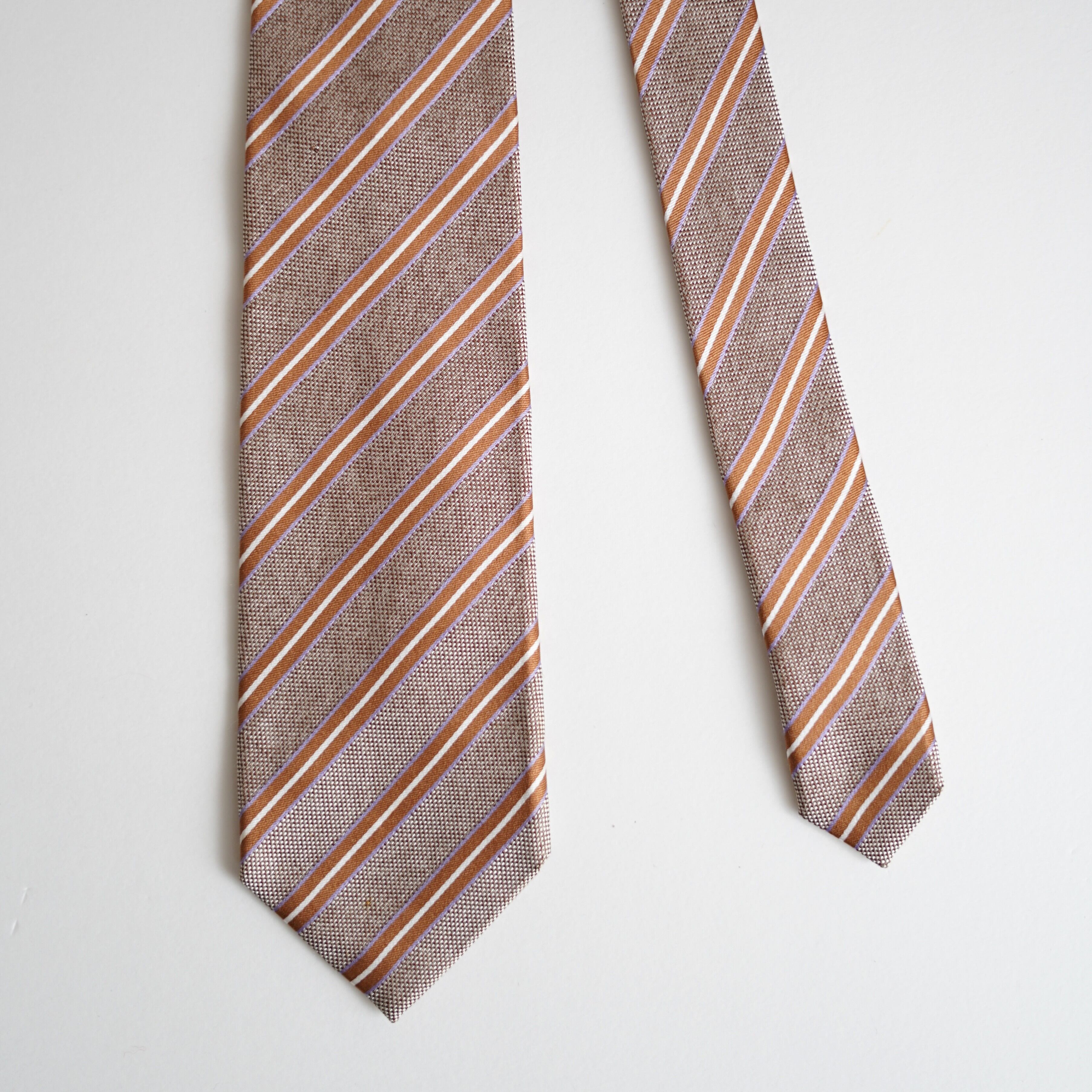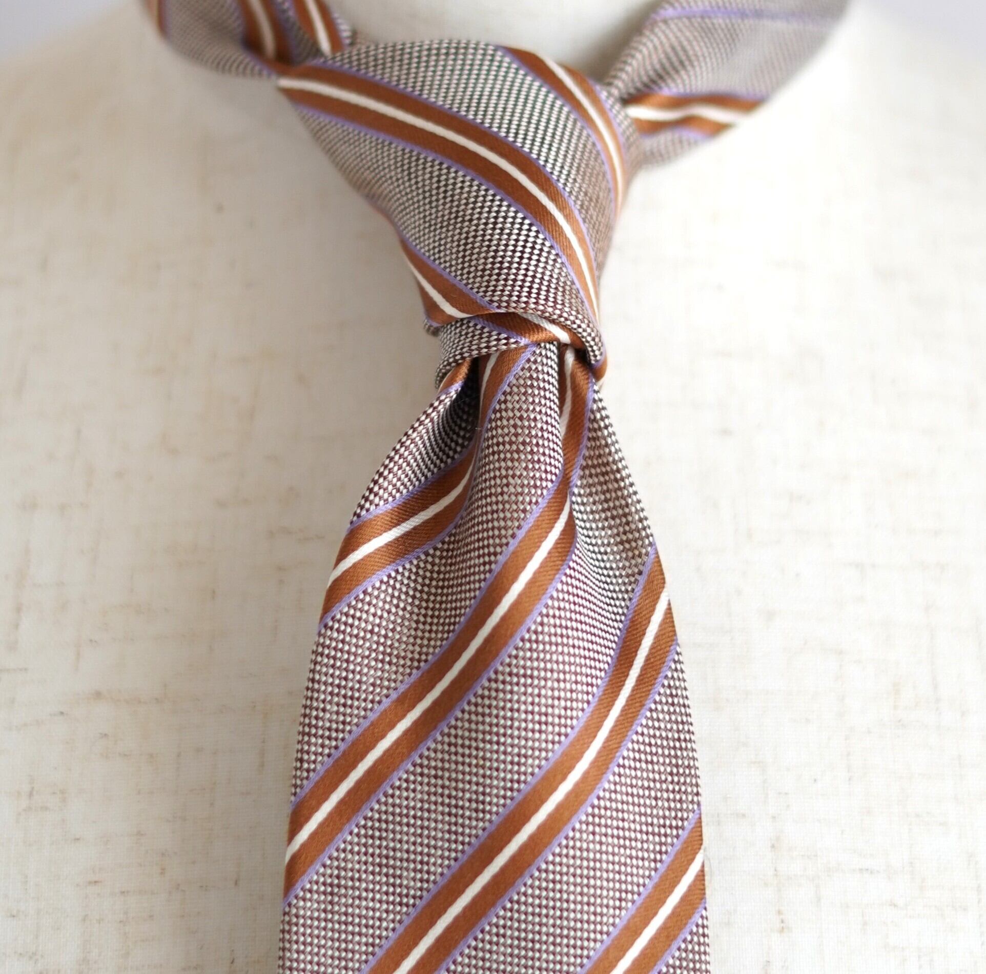 上質なシルク素材を用い、色柄のバランスや結び目の立体感にまで配慮されたネクタイは、端正でありながらどこか温もりを感じさせる佇まい。クラシックを軸に、時代に左右されない普遍的な魅力を大切にしています。