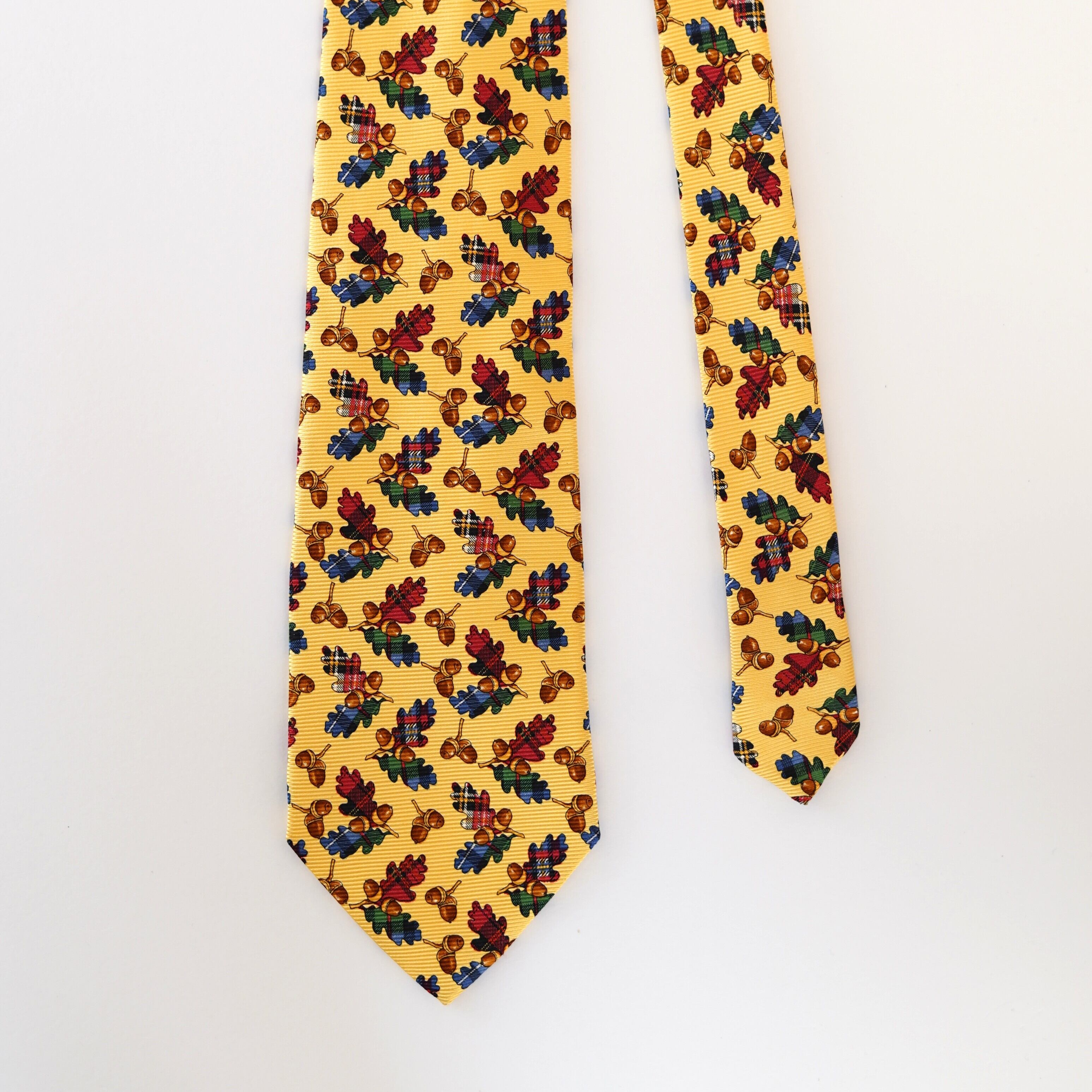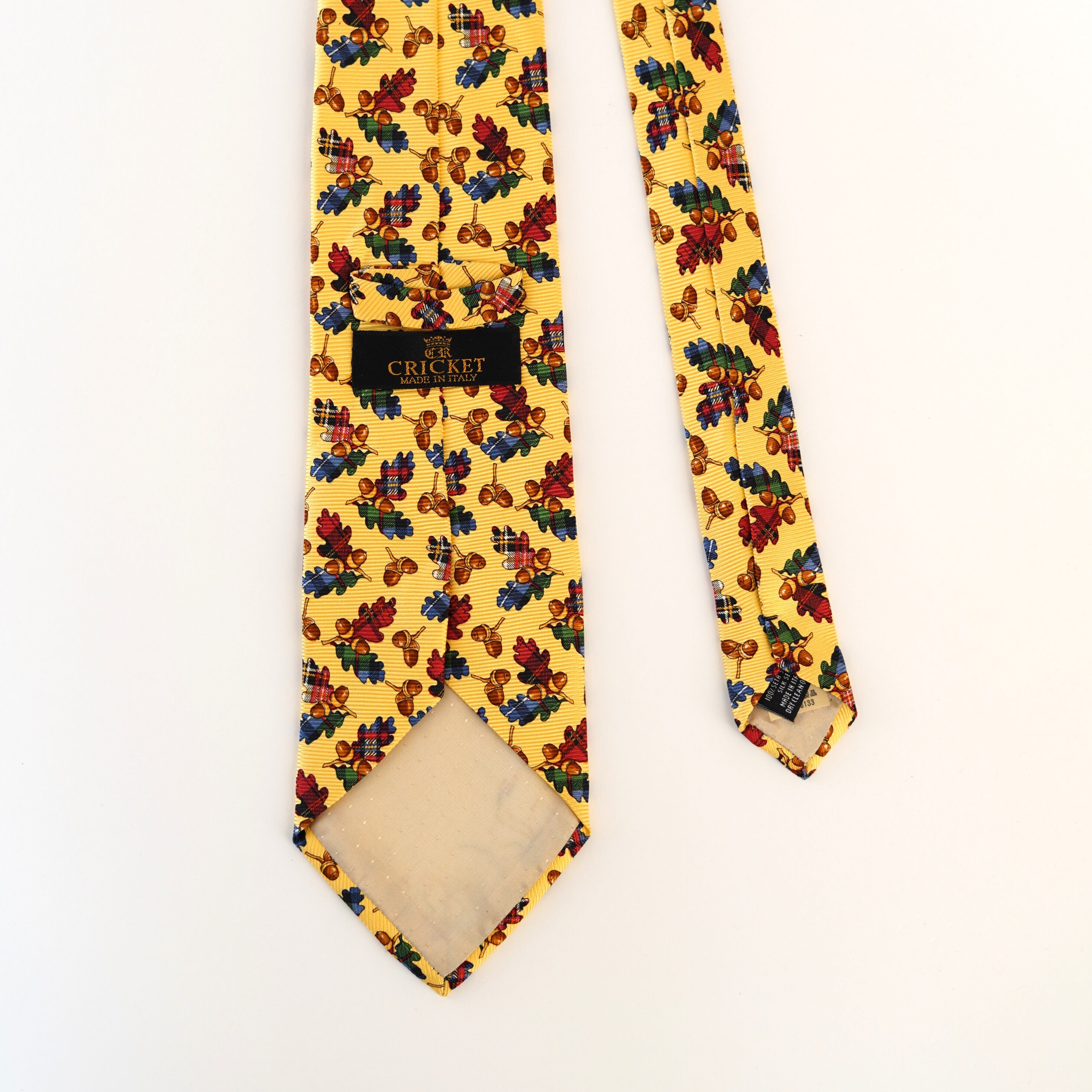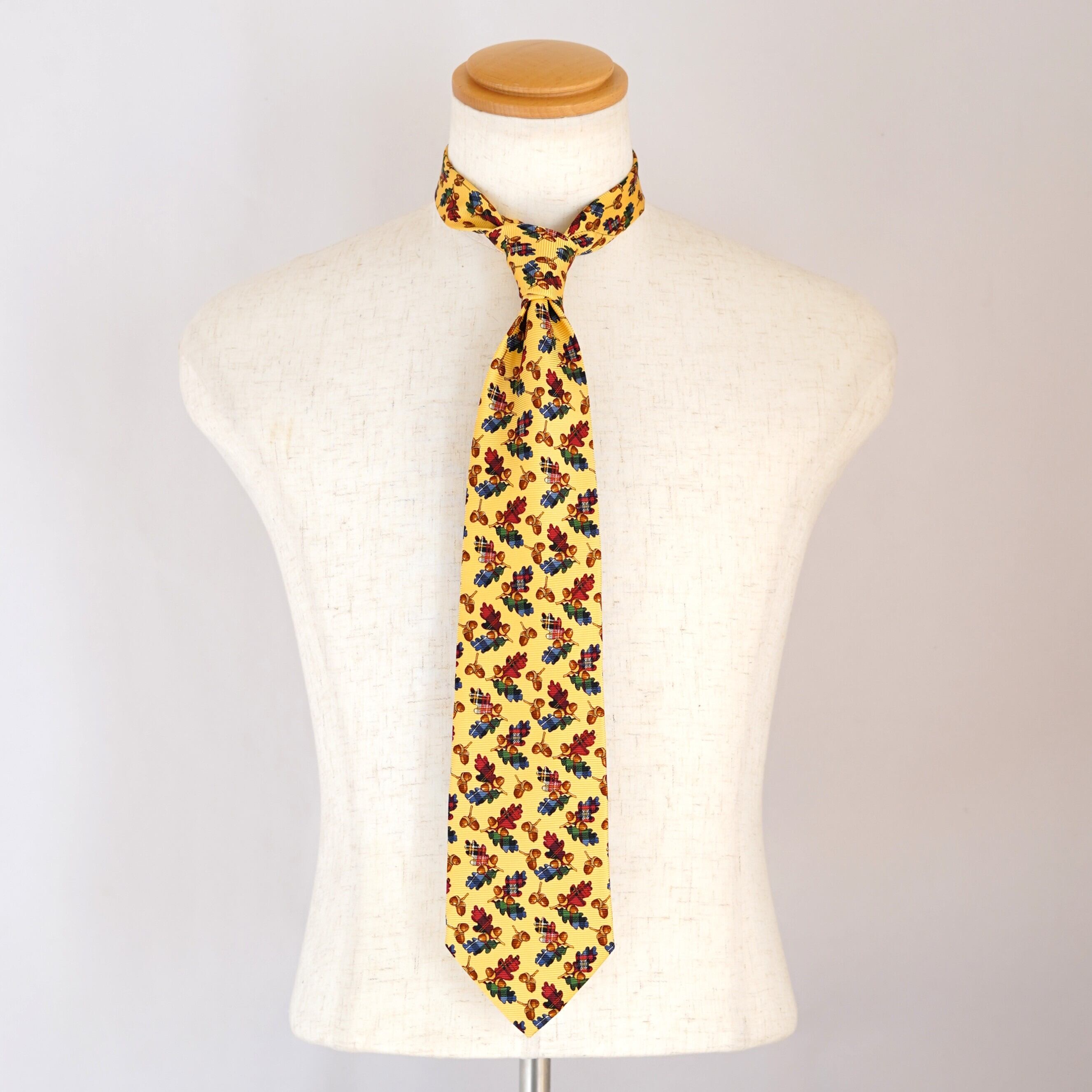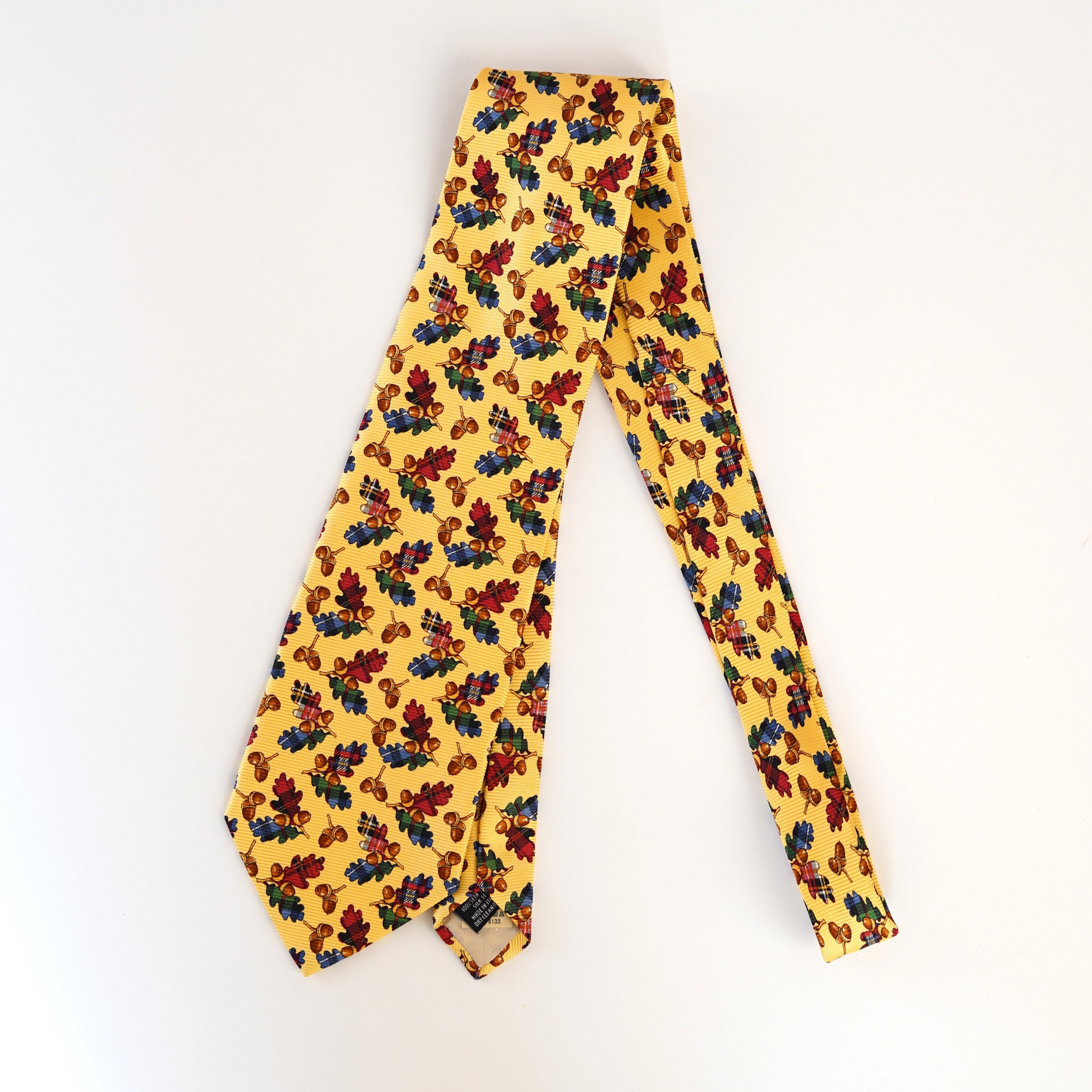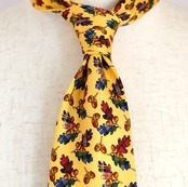 ポップなイエローをベースに、愛らしいどんぐり柄を散りばめたクリケットのネクタイ。ひと目で心が弾む配色とモチーフは、装いにさりげないユーモアと余裕を添えてくれます。トラッドを軸にしながらも、堅くなりすぎない遊び心たっぷりのデザイン。いつものスーツスタイルに変化をつけたい日や、会話のきっかけをつくりたいシーンにもおすすめの一本です。