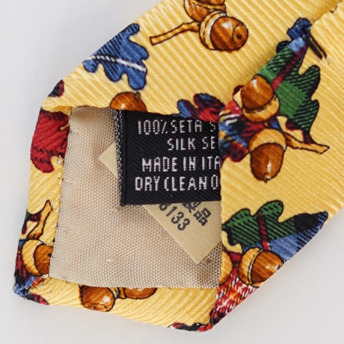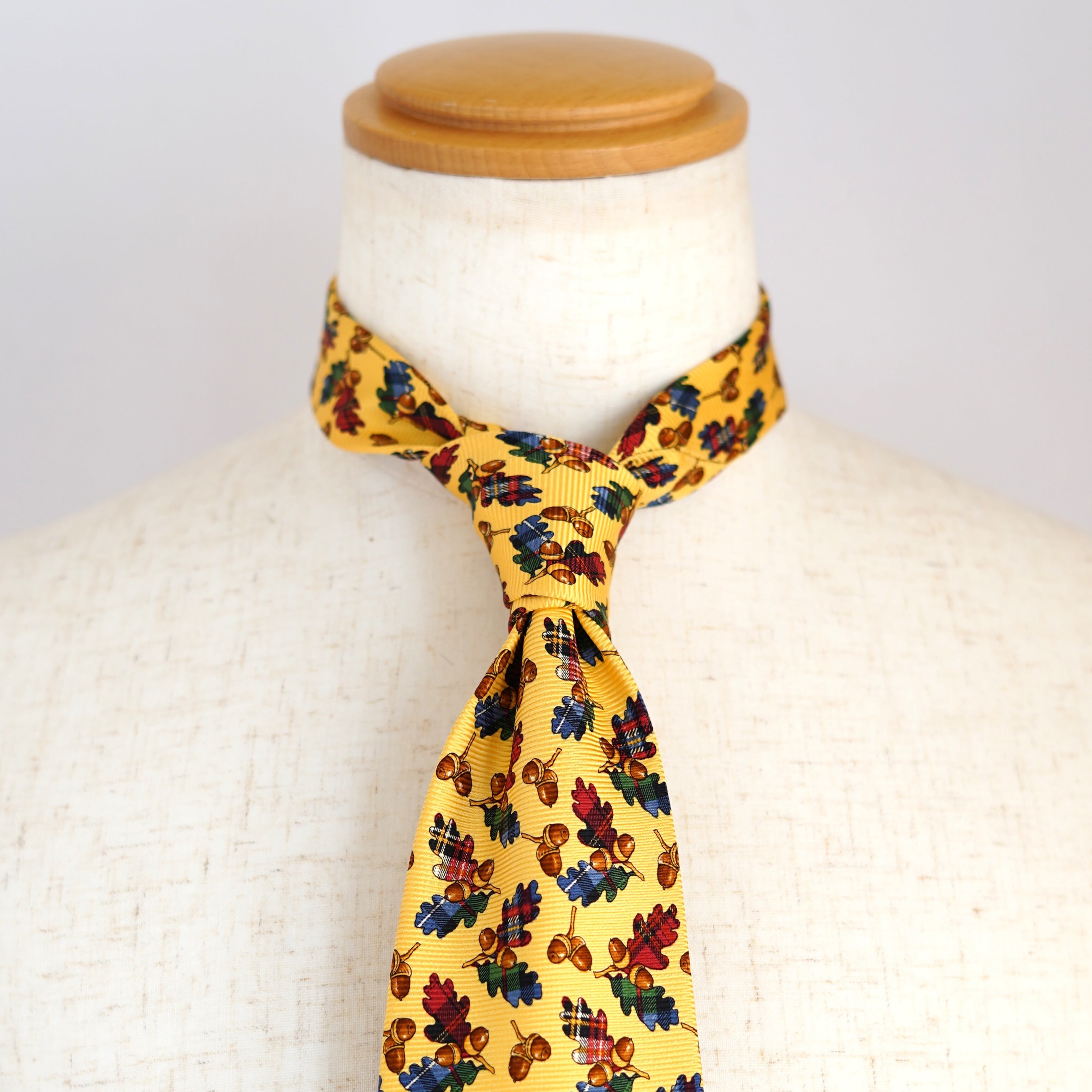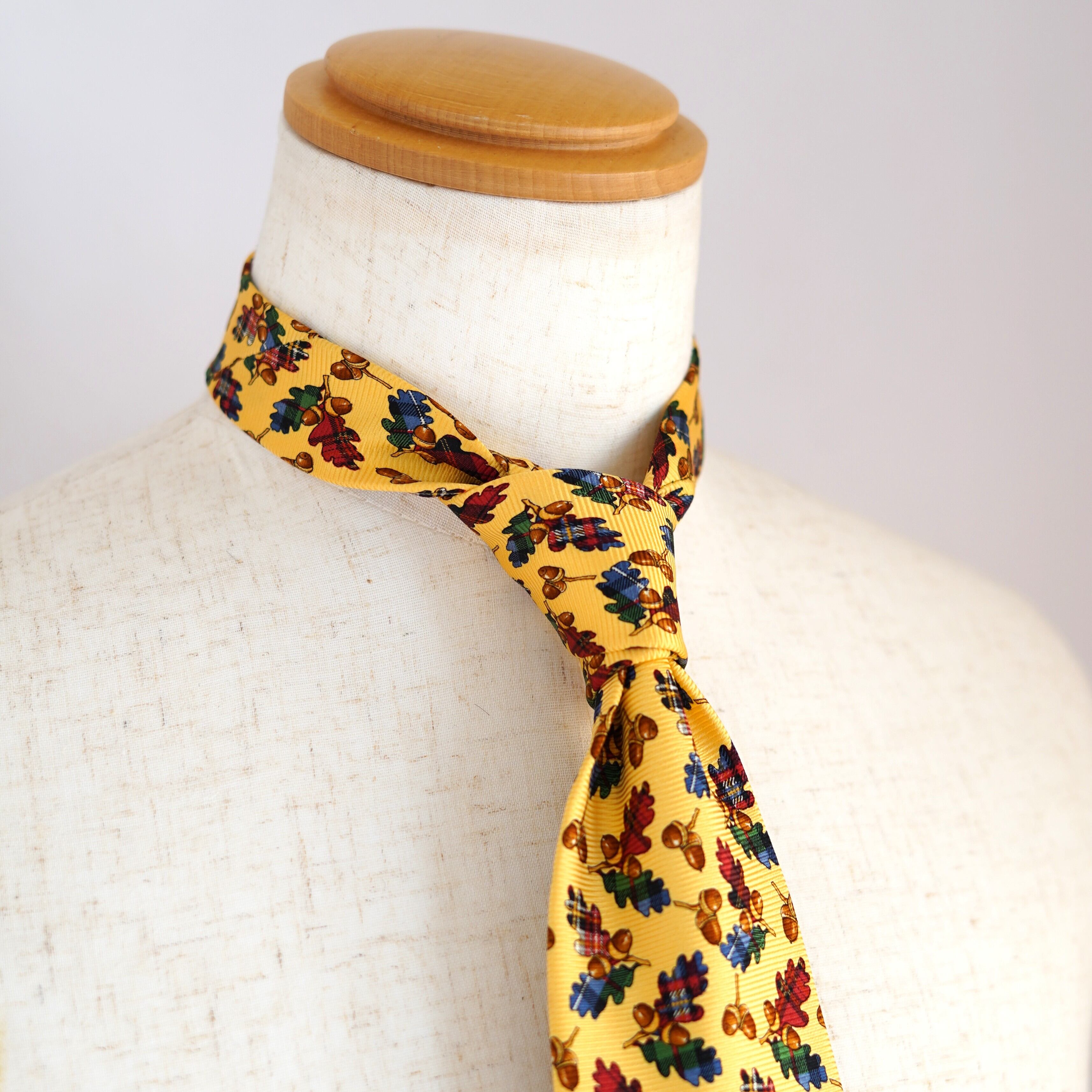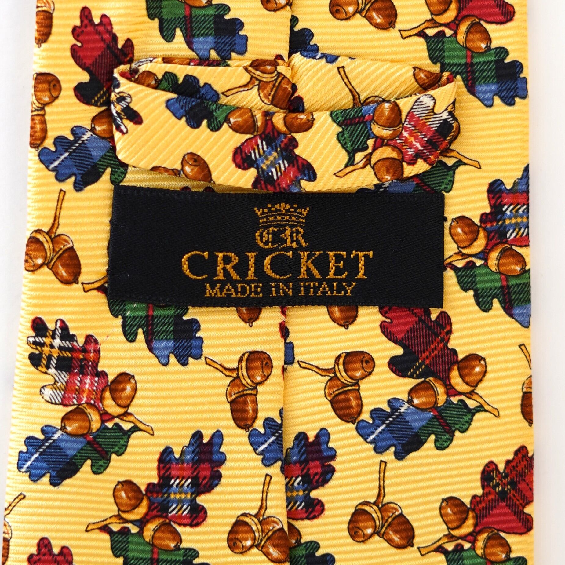 ポップなイエローをベースに、愛らしいどんぐり柄を散りばめたクリケットのネクタイ。ひと目で心が弾む配色とモチーフは、装いにさりげないユーモアと余裕を添えてくれます。トラッドを軸にしながらも、堅くなりすぎない遊び心たっぷりのデザイン。いつものスーツスタイルに変化をつけたい日や、会話のきっかけをつくりたいシーンにもおすすめの一本です。